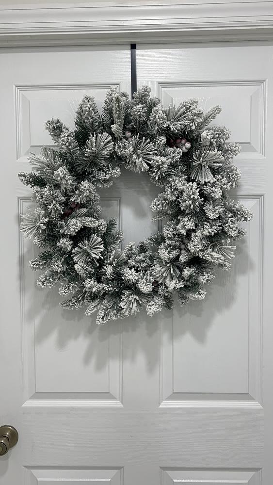 Bring a snowy, timeless touch to your entry with this 24in. Flocked Pine and Berry Wreath featuring 110 flocked pine tips. The white flocked finish creates a fresh winter look and adds soft texture that stands out on any door or wall. The snow-dusted wreath fits beautifully on the front door, above the mantel, or in a hallway. Crafted from plastic for low-maintenance seasonal decor, it keeps its shape and color through the holidays. Full, soft pine tips create a natural silhouette that suits modern, classic, or farmhouse styles. Display as is for a clean winter statement, or layer in ribbon and lights to make it your own.