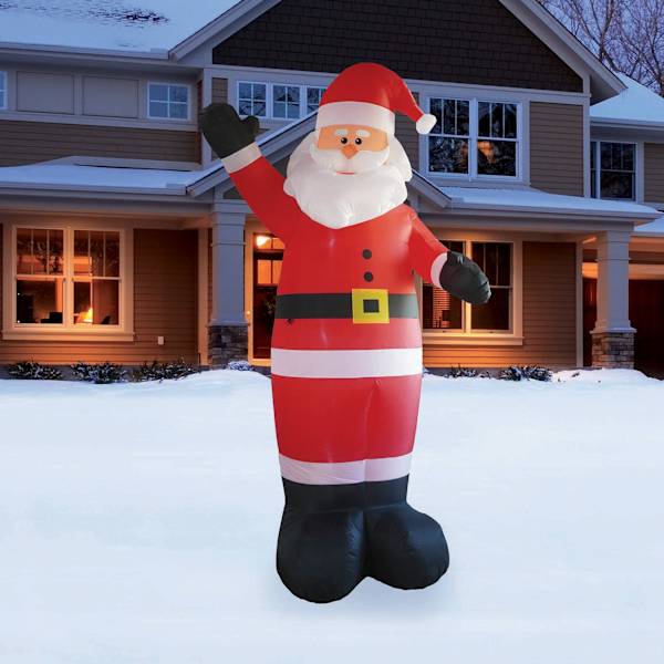 Out 12ft. Santa Airblown inflatable turns your space into instant holiday cheer. At an overall 66×48× 44in., the classic red and white suit and friendly smile create a bold, joyful centerpiece. Plug-in LED lighting adds a bright, even glow that pops after dark. Made of polyester with traditional, easy-to-recognize details. Set it by the porch, walkway, or front and center on the lawn and let this huge Santa welcome guests all season long.