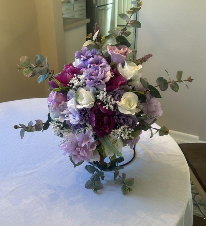 - Vibrant Purple and White Ranunculus, Hydrangea, and Cosmos Mixed Floral Bush.