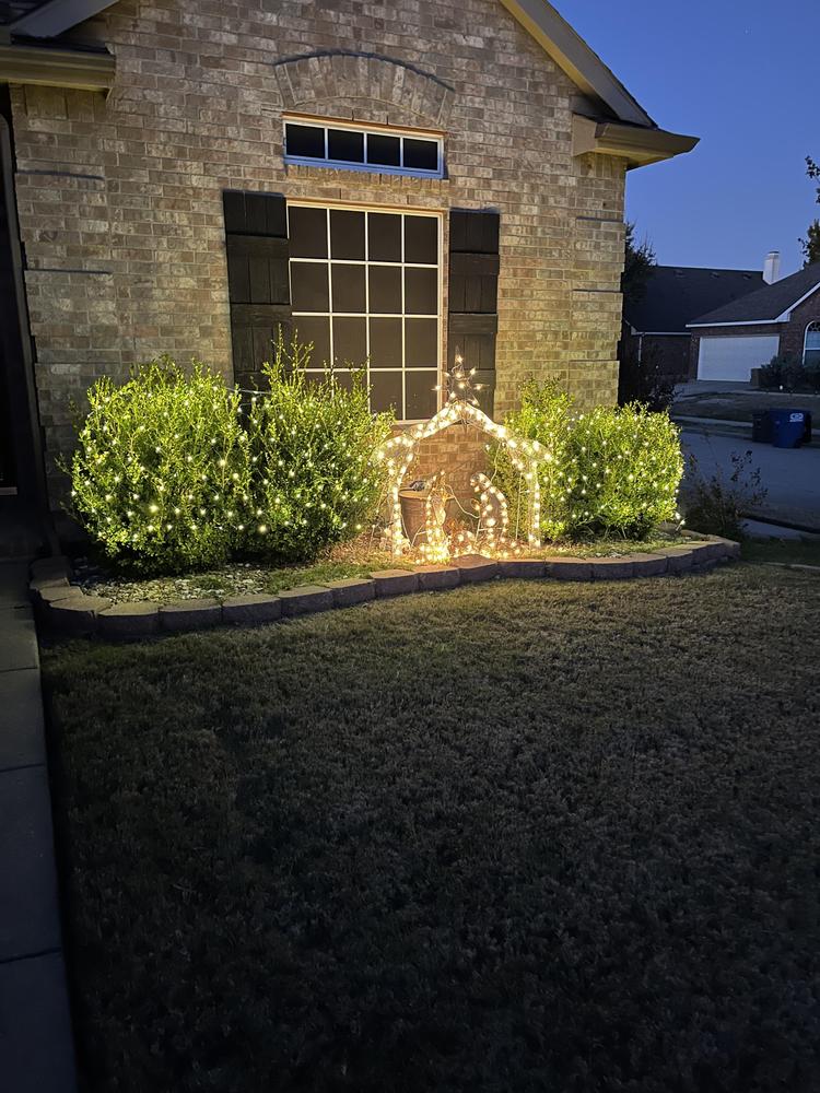 Warm white string lights over large plants