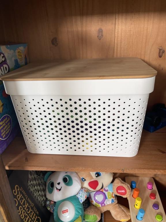 - 2-pack plastic bin with bamboo lid for convenient storage.