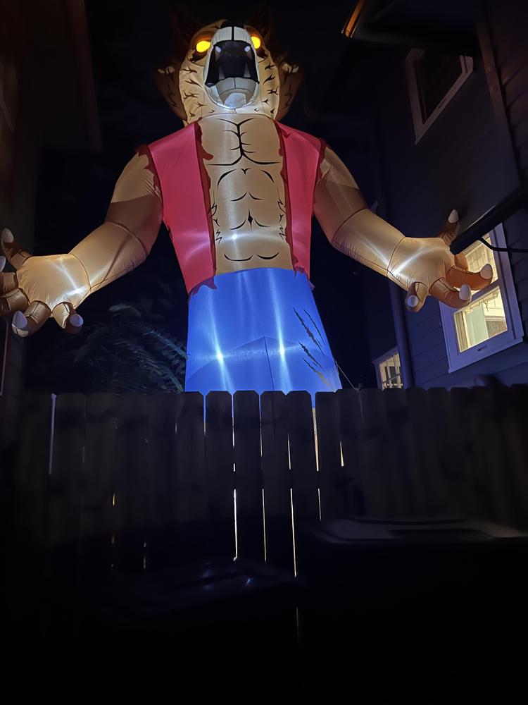 Blow up your holiday curb appeal with this oversized 20ft. Werewolf Halloween Inflatable Decoration. This creepy character is sure to draw attention. Whether you place this Halloween inflatable in the front yard or backyard, it serves as a bold and eye-catching seasonal centerpiece. Passers-by will be drawn to its unique and colorful presence, making your home stand out in the neighborhood during the festive season. The polyester werewolf comes with a blower to quickly inflate this amazing decoration. When the festivities are over, deflating and storing this blow up is equally simple. You can fold it up and tuck it away for continual use for years to come. The inflatable lighted werewolf with glowing eyes is full of spooky personality and provides an interactive element for trick-or-treaters and party goers all season long.