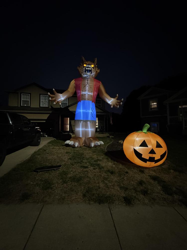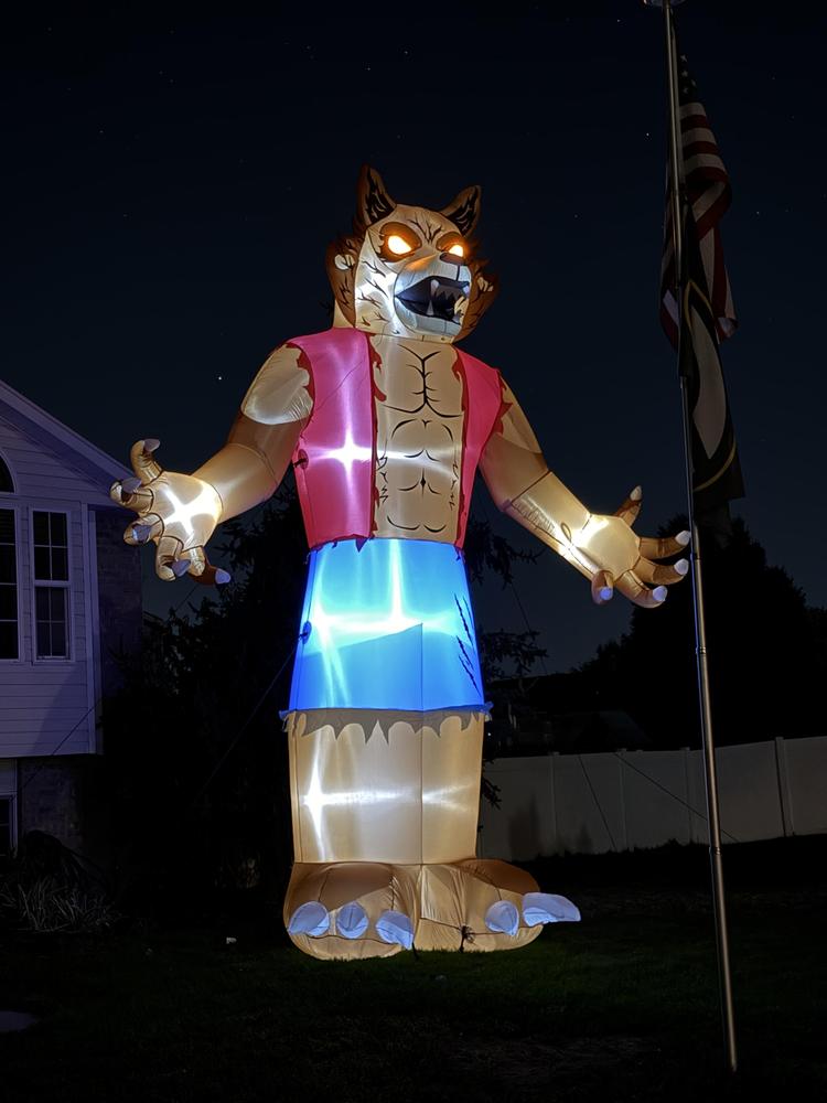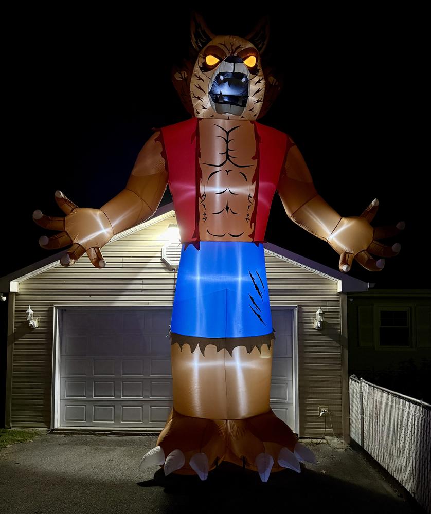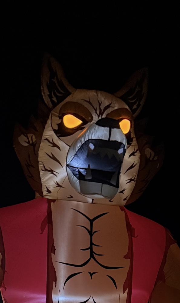 Blow up your holiday curb appeal with this oversized 20ft. Werewolf Halloween Inflatable Decoration. This creepy character is sure to draw attention. Whether you place this Halloween inflatable in the front yard or backyard, it serves as a bold and eye-catching seasonal centerpiece. Passers-by will be drawn to its unique and colorful presence, making your home stand out in the neighborhood during the festive season. The polyester werewolf comes with a blower to quickly inflate this amazing decoration. When the festivities are over, deflating and storing this blow up is equally simple. You can fold it up and tuck it away for continual use for years to come. The inflatable lighted werewolf with glowing eyes is full of spooky personality and provides an interactive element for trick-or-treaters and party goers all season long.