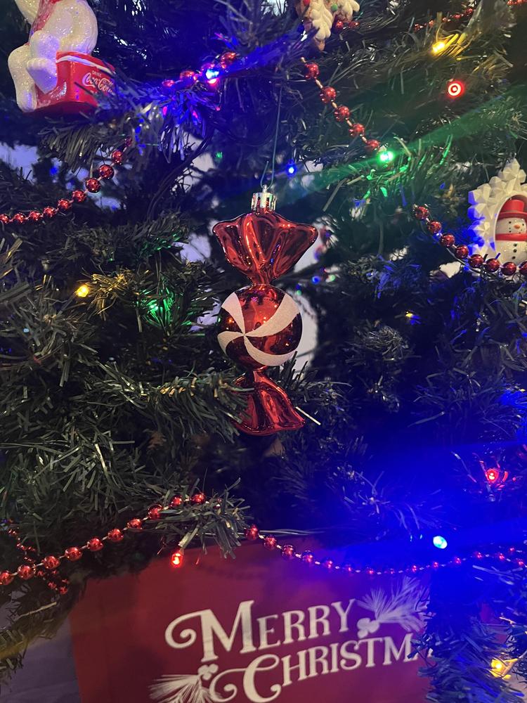 Dress your tree with a festive set of four 5in. red and white candy ornaments featuring swirls for a playful, classic look. The glossy finish and twist-end shapes bring eye-catching movement to your Christmas ornaments and holiday decor. Made from shatterproof plastic, they're lightweight and family friendly. Each ornament creates a bold accent on trees, garlands, or wreaths. Boxed for easy gifting and storage, this timeless set mixes effortlessly with traditional Christmas indoor decor. Ready to hang for instant seasonal style and rich red Christmas color.