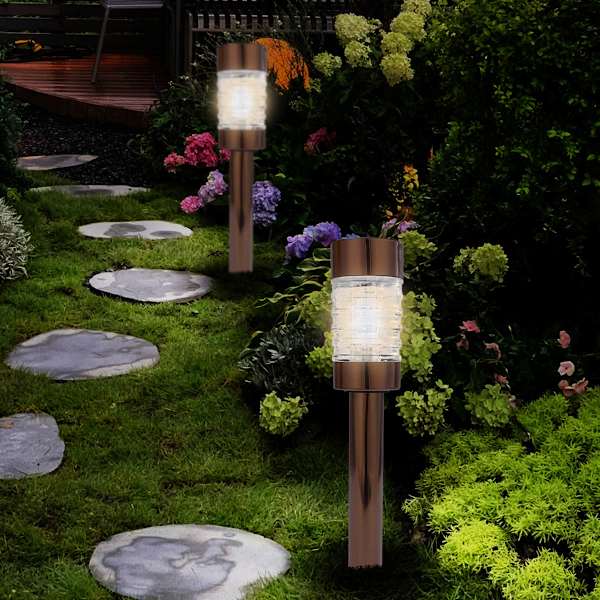 Solar lights will light up your summer nights! Our 4-Pack 6-Lumen Solar Oil Rubbed Bronze Round Steel Solar Pathway Lights have a solar panel that absorbs the sun's energy during the daytime and turns on at night automatically. Place throughout the garden and enjoy your warm summer evenings outside with just a touch of mood lighting. Constructed of metal and glass.