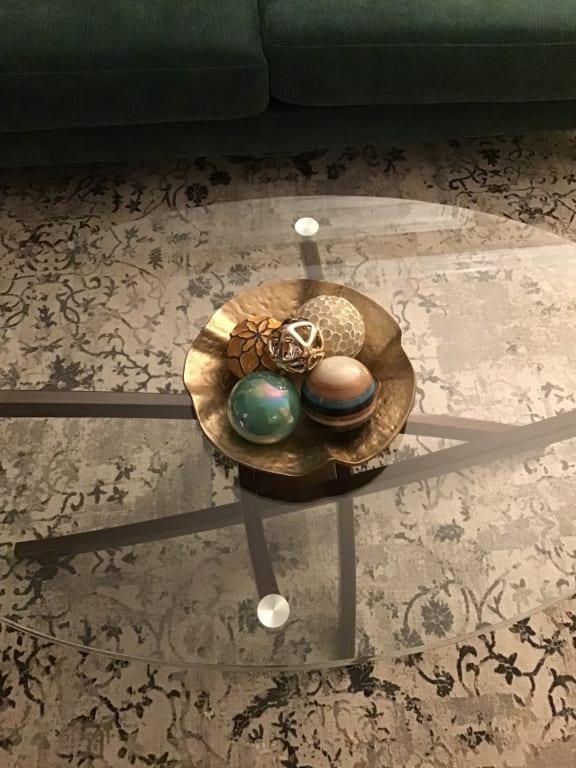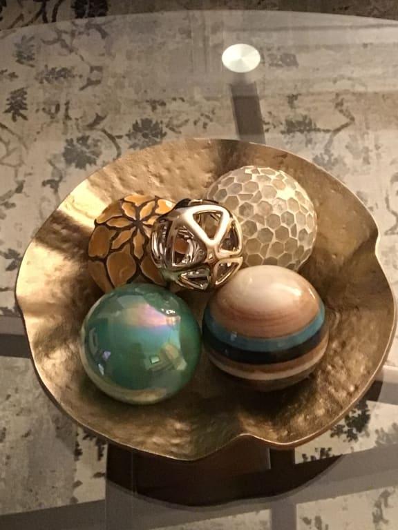 I needed some thing to pull the gold from the mirror and then match the gray and wood tones, it was perfect. I paired it with a gold tangle and put in front of a large vase of flowers! I love it. It's flat on the bottom and about the size of a softball.