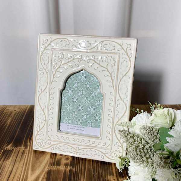 Explore what's right around the corner. Choose your own adventure every day. Savor it all and say yes to what comes next. Found & Fable is a collection only found at At Home. Capture life's precious moments with our 4x6in. Found & Fable Ceramic Tabletop Frame. Designed for displaying a single 4x6 photo, it effortlessly complements any modern decor. Its embossed floral vine motif frame design adds a touch of bohemian chic to your living spaces.