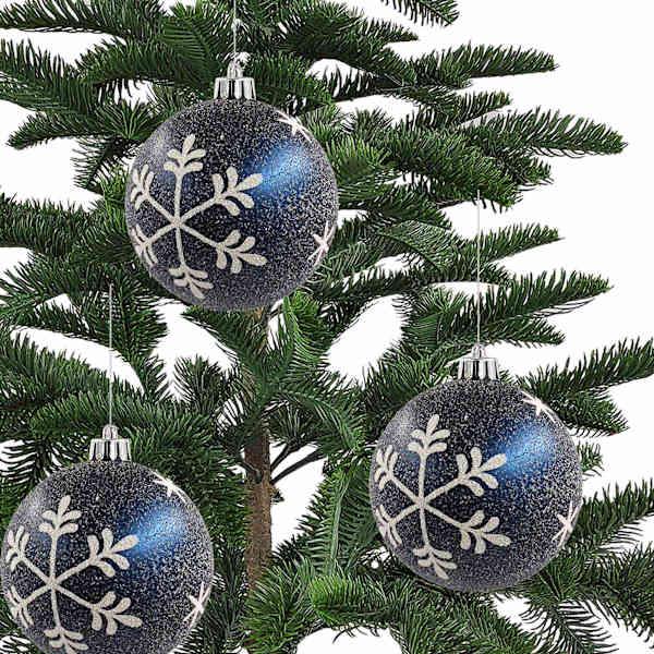Bring a cool winter glow to your tree with this 6-count set of blue snowflake Christmas ornaments. Each is 3in. round and crafted from plastic with a mix of matte, glossy and glitter finishes for subtle sparkle. Crisp white snowflake details create a timeless look that pairs beautifully with silver, navy and evergreen. Shatterproof construction and pre-attached hangers make decorating easy and worry-free. Perfect for trees, garland and wreaths, these ornaments add a cohesive, wintry touch to your holiday decor.