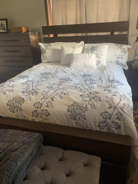 - Includes a king-sized comforter, one tailored bedskirt, two pillow shams, and three decorative pillows.