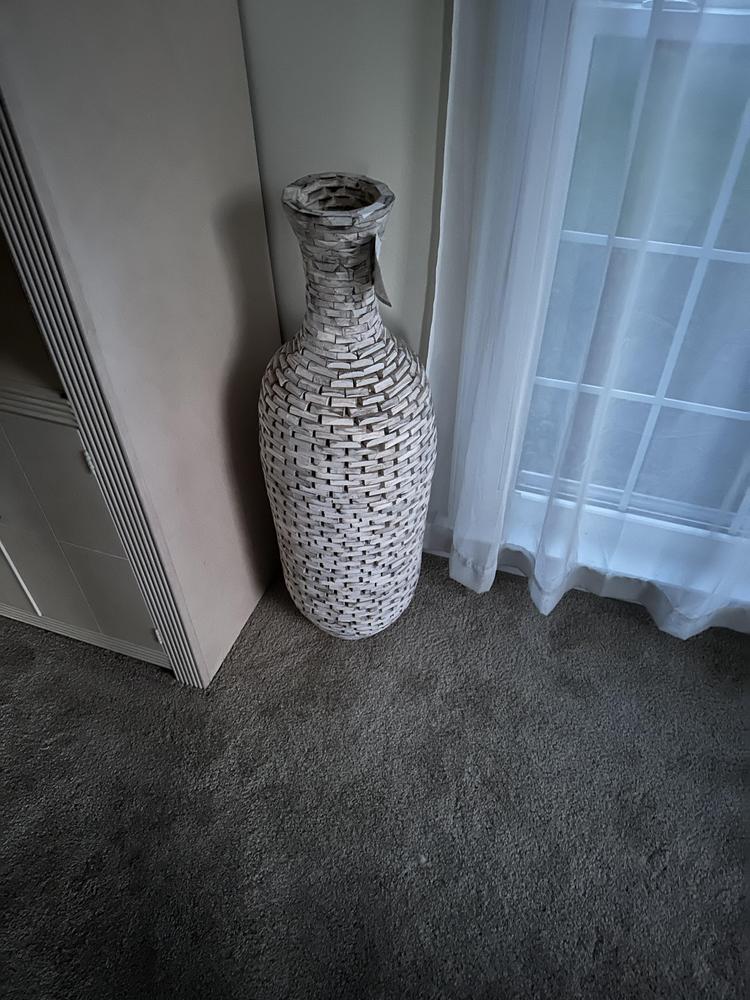Add a modern spin to green living with this tall wood floor vase. Sure, you might already be sorting your paper and plastic, but now you're upcycling wood, too! This farmhouse style floor vase blends recycled acacia wood with faux wood in a woven design that's the perfect natural complement to your down-to-earth decor. Incorporate more natural elements by filling this vase with your favorite flowers or branches. You'll be a true environmentally friendly rockstar when you have fresh flowers and a natural vase showcased in your home!