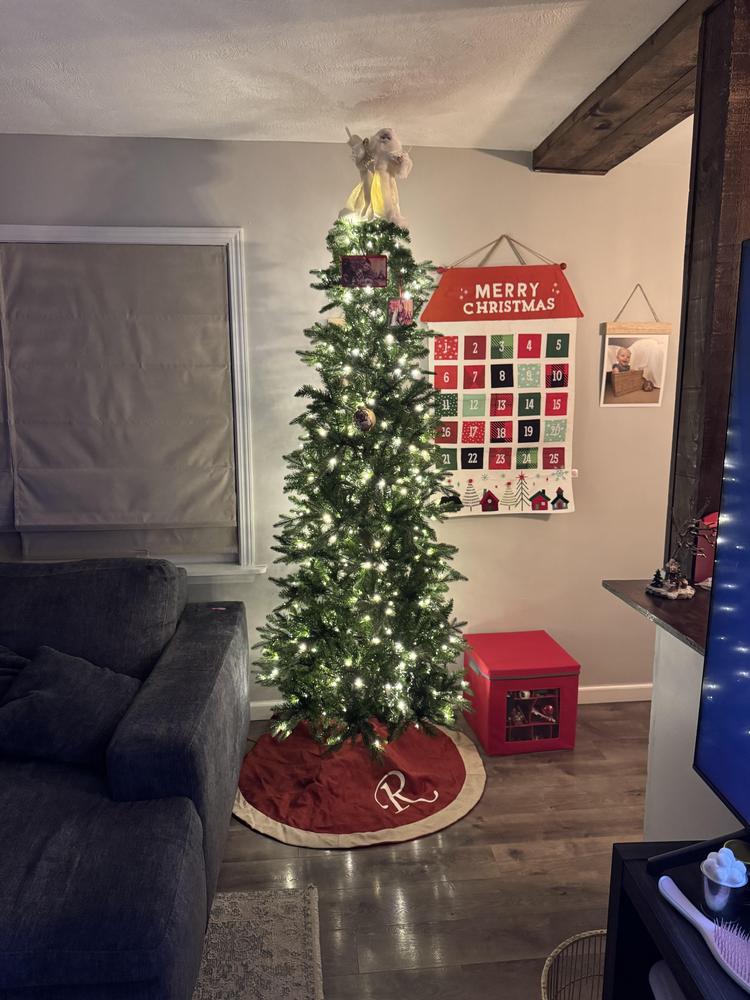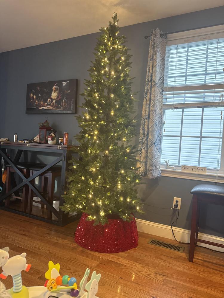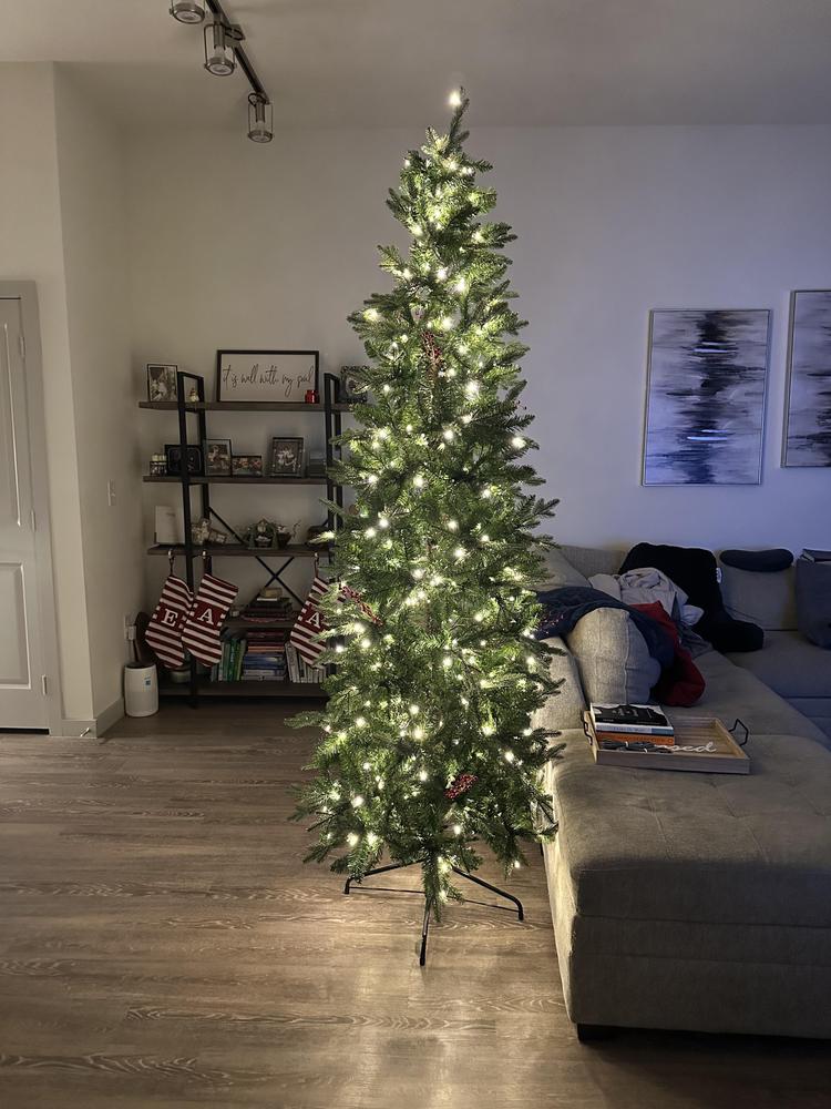 Skip the trip to a tree lot this year and anchor your holiday decorations with this 7.5ft. Pre-Lit LED Artificial Seattle Spruce Christmas Tree with 36in. diameter. Just as festive as a live tree, this piece is made with metal-hinged branches that are covered with 1538 green tips and comes with 400 pre-strung warm white LED lights. This tree features a full shape broken up into assembly sections to make storage easy. It also arrives with an included metal stand, so all you need to do is add a tree skirt, your favorite ornaments then sit back and enjoy the season.