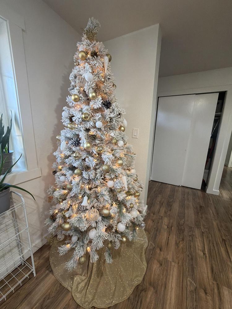 Perfect tree for my small spot, but this tree is not small looking and has a big presence! The flocking doesn't shed as I thought it might, the pinecones are a nice added touch and the white lites are a warm yellow white which lends itself beautifully to gold ornaments.