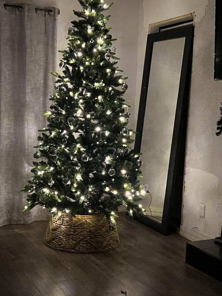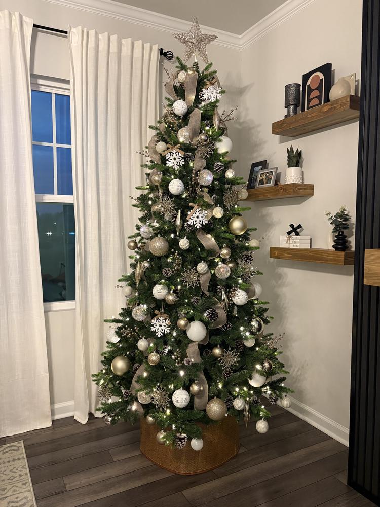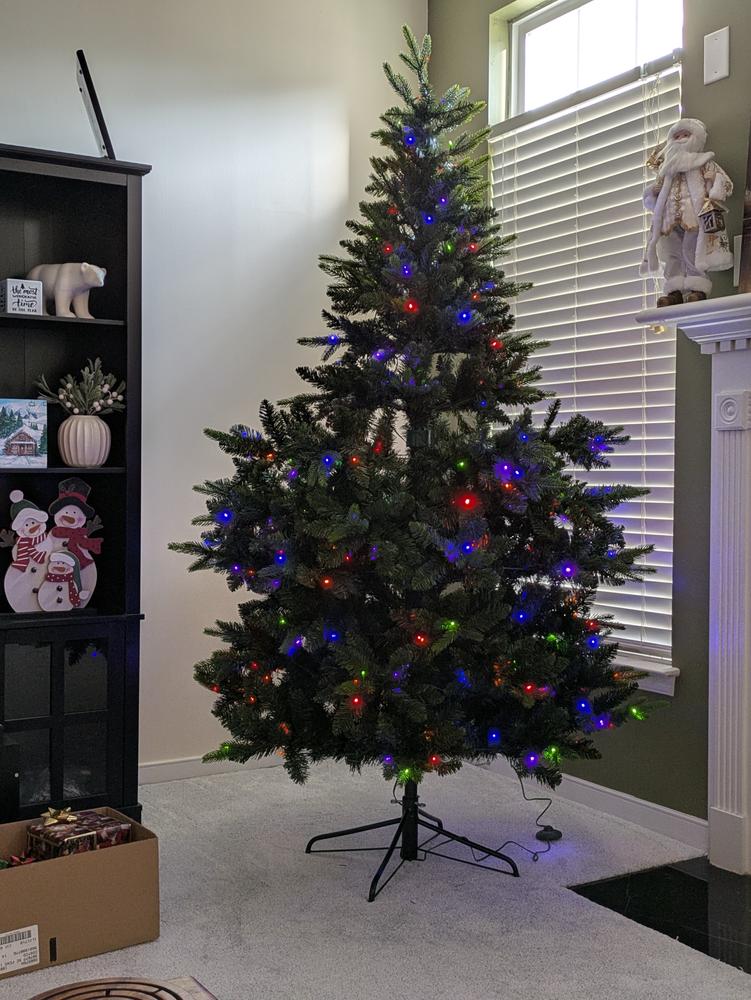 A classic spruce silhouette in rich green, our 7.5ft. Pre-Lit Hartford Spruce stands tall to anchor your holiday scene. 300 built-in color-changing LED lights are already woven through the branches for a clean, fuss-free glow. With a 1322 mixed PVC tip count, the plastic needles look realistic and are easy to shape for full, balanced coverage. This tree features a 48in. diameter, offering generous height with a space-smart footprint. Style it with your favorite ornaments and enjoy an effortless centerpiece from the first switch-on. Metal stand included.
