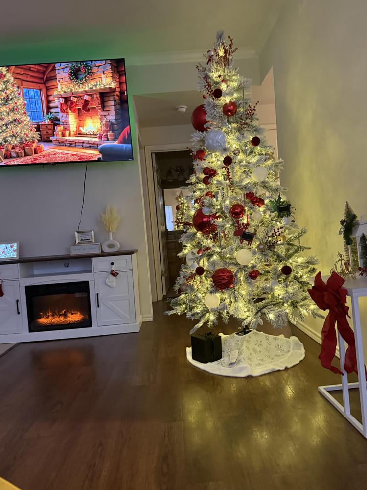 Snow-kissed and ready to glow, this pre-lit 7.5ft. pine stands tall with a space-smart 47in. diameter. The soft flocking brings a fresh winter look while the 350 color-changing built-in lights with 8 different functions add instant sparkle. Realistic plastic needles and an 869 tip count fluffs easily for a full silhouette. This wonderful, flocked pine tree slips neatly into living rooms, corners, or entryways. Set it up, plug it in, and let the season shine.