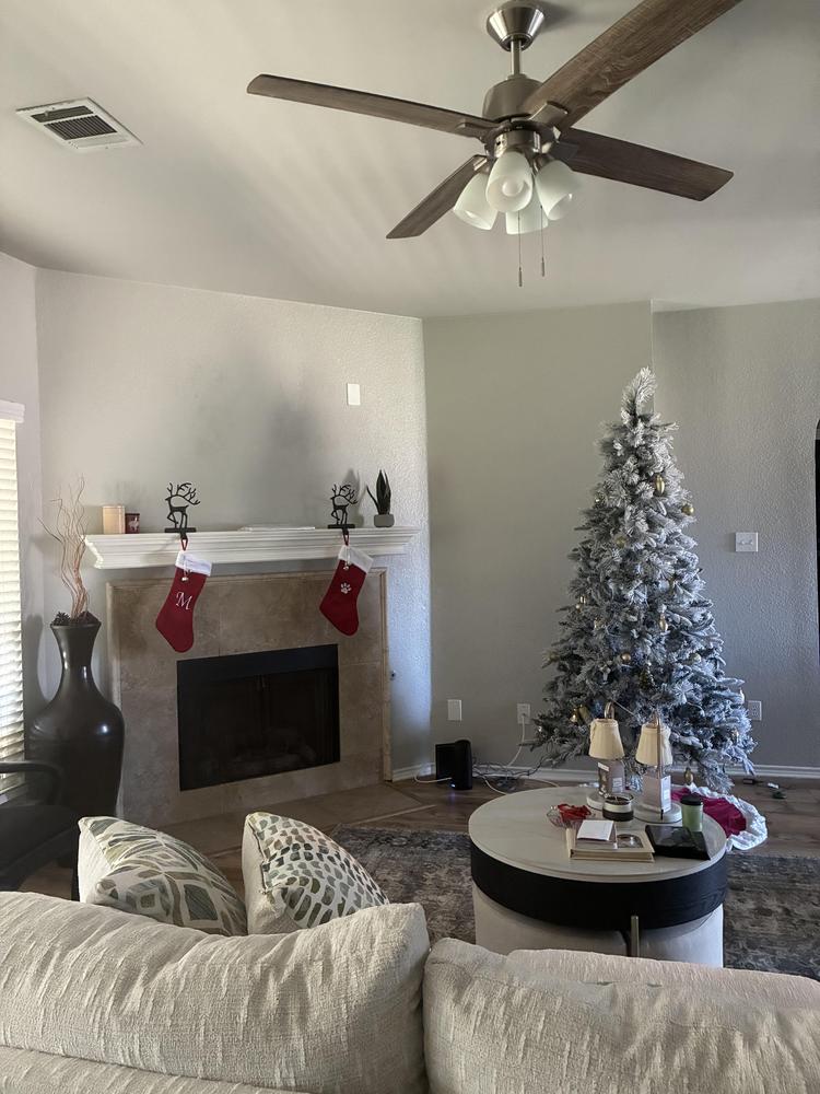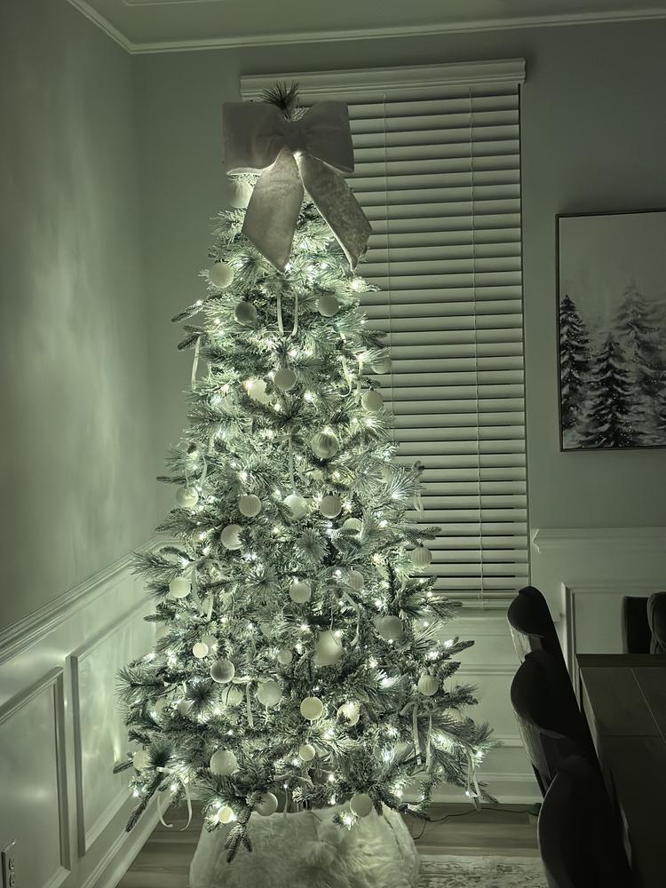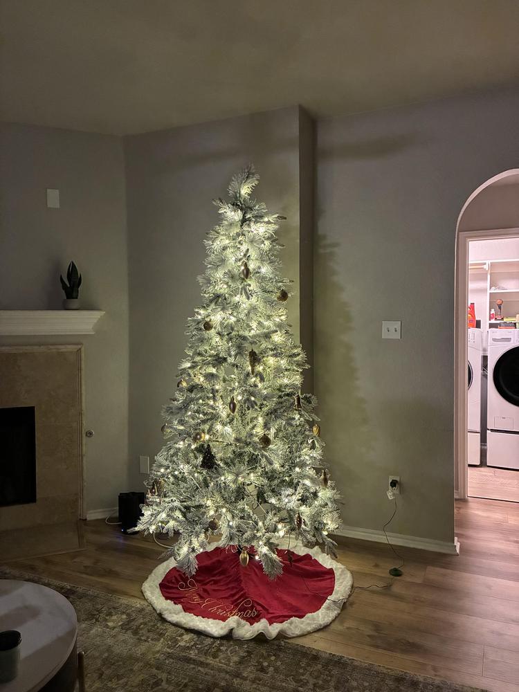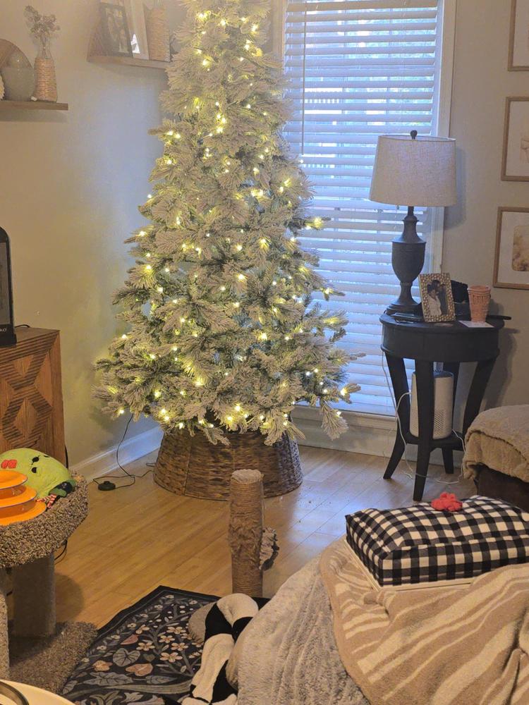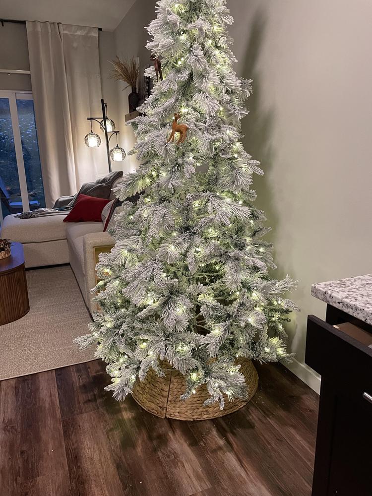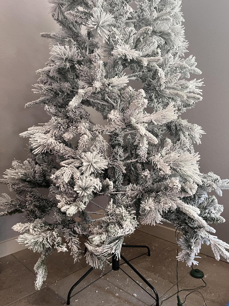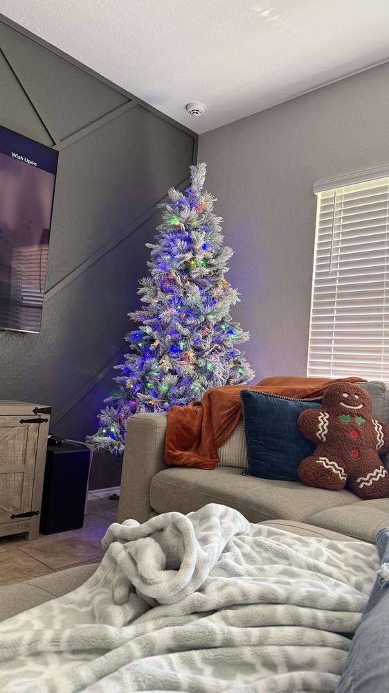 Snow-kissed and ready to glow, this pre-lit 7.5ft. pine stands tall with a space-smart 47in. diameter. The soft flocking brings a fresh winter look while the 350 color-changing built-in lights with 8 different functions add instant sparkle. Realistic plastic needles and an 869 tip count fluffs easily for a full silhouette. This wonderful, flocked pine tree slips neatly into living rooms, corners, or entryways. Set it up, plug it in, and let the season shine.