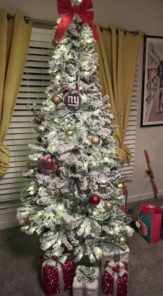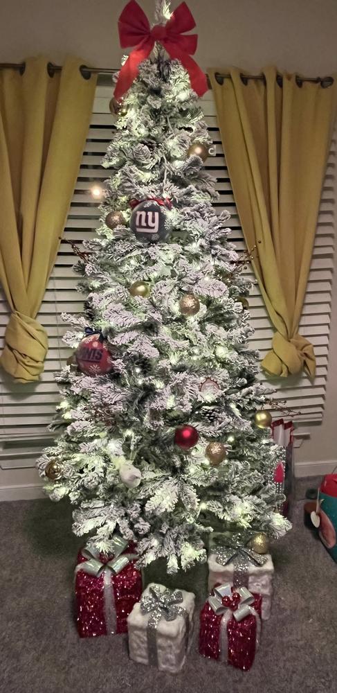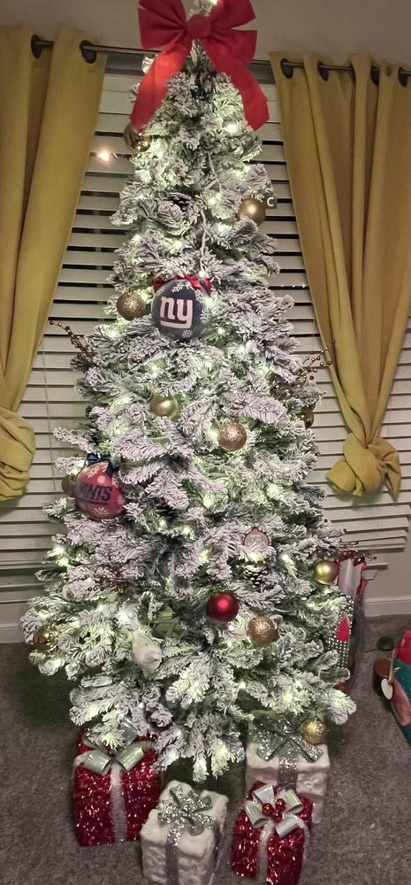 CheckoutOur 7ft. Pre-Lit Flocked Granger Fir Christmas Tree with 41in. diameter is an exquisite addition to your holiday decor, featuring a lush design with 800 tips for a full appearance. This tree is equipped with 300 color-changing LED micro lights with 4 different functions, creating a bright and colorful festive ambiance. Enjoy the convenience of a plug-in tree that enhances your Christmas celebrations with elegance and charm. Metal stand included.