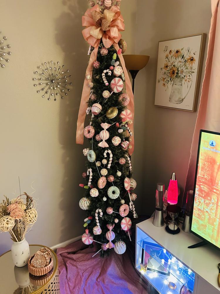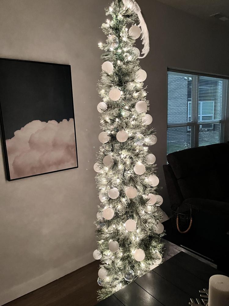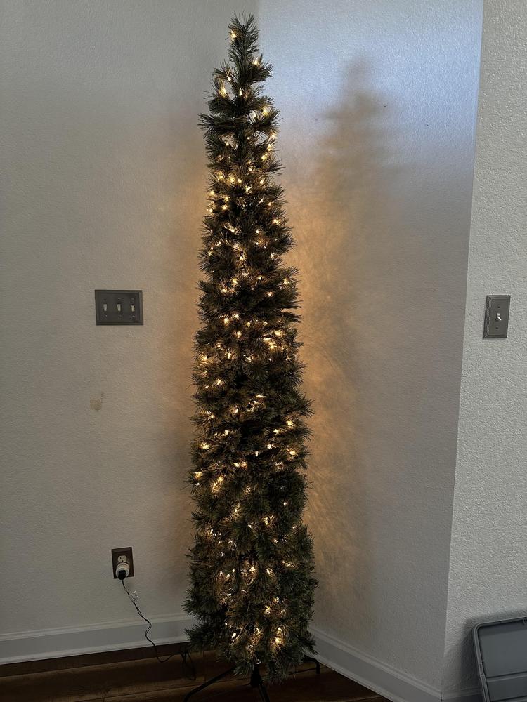 Skip the trip to a tree lot this year and anchor your holiday decorations with this 7ft. Pre-Lit Artificial Slim Cashmere Pine Christmas Tree with 18in. diameter. Just as festive as a live tree, this piece is made with metal-hinged branches that are covered with 350 green tips and comes pre-lit with 300 clear white incandescent lights. This Christmas tree features a full shape broken up into assembly sections to make storage easy. It also arrives with an included metal stand, so all you need to do is add a tree skirt, your favorite ornaments then sit back and enjoy the season.