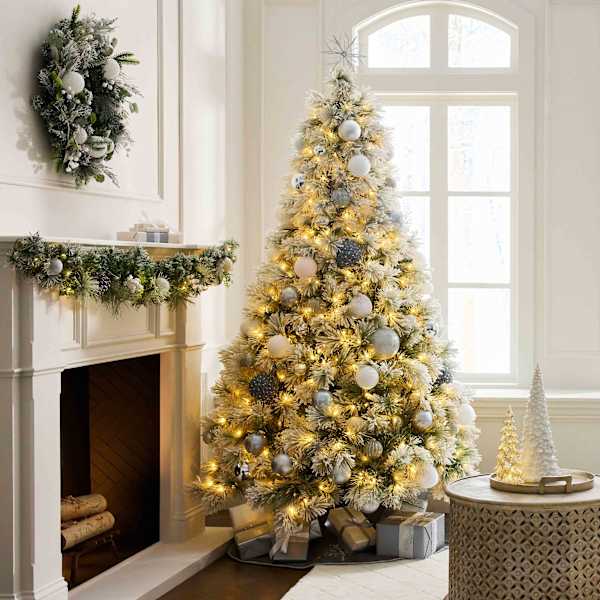 Snow covered and ready to shine, this 7.5ft. Pre-Lit LED Flocked Static Pine brings a calm, wintry look to your space. Thick, flocked branches and static LEDs create an even, steady glow that feels cozy from every angle. At 90in. tall with a 58in. diameter, offering a full, balanced silhouette without overwhelming the room. Featuring 450 warm white LED lights. Plug-in design makes setup simple, while the timeless shape fits seamlessly with everything from minimal to classic seasonal decor. Crafted with 680 tips and a soft white finish for that just-snowed look. Dress it up or keep it simple—either way, it's an instant centerpiece. Includes folding metal stand.