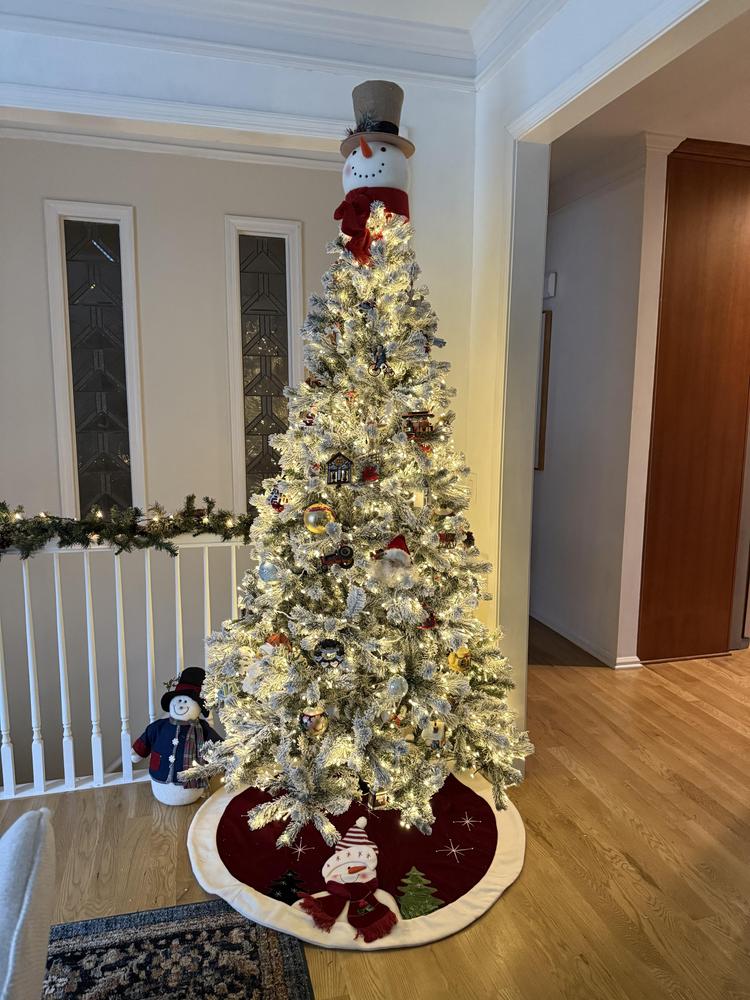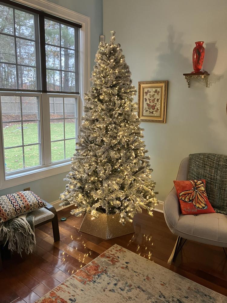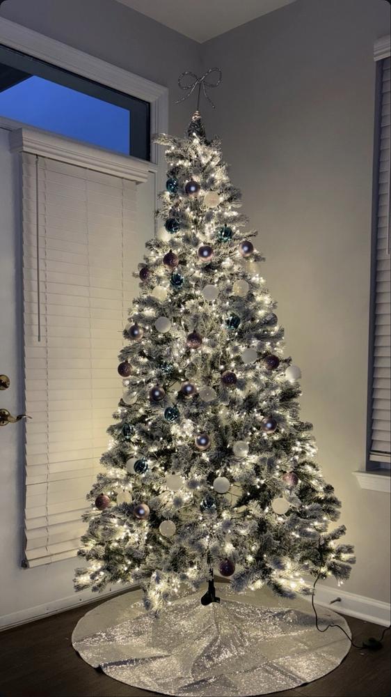 Invite a wintery glow into your space with the 7ft. Pre-Lit Flocked Anderson Spruce Tree. Lush green branches dusted with soft flocking create a fresh, snow-kissed look, while the 2010 built-in warm white LED lights switch on instant ambience. With a 46in. diameter, it offers a full presence without overwhelming the room. Crafted from plastic and featuring 1060 mixed PVC tips for easy care and season-long display. Dress it with your favorite ornaments or let its gentle sparkle take center stage. Metal stand included.