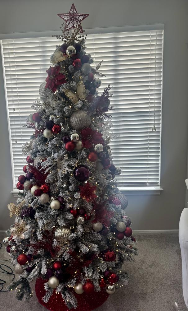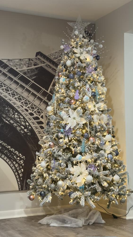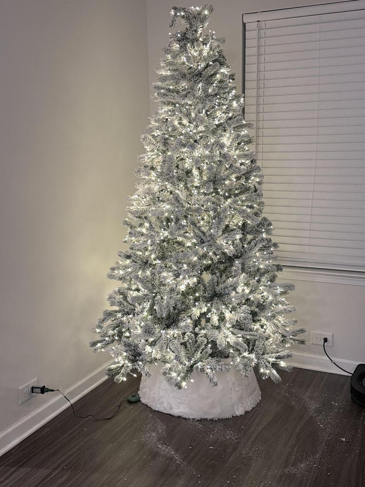 Invite a wintery glow into your space with the 7ft. Pre-Lit Flocked Anderson Spruce Tree. Lush green branches dusted with soft flocking create a fresh, snow-kissed look, while the 2010 built-in warm white LED lights switch on instant ambience. With a 46in. diameter, it offers a full presence without overwhelming the room. Crafted from plastic and featuring 1060 mixed PVC tips for easy care and season-long display. Dress it with your favorite ornaments or let its gentle sparkle take center stage. Metal stand included.