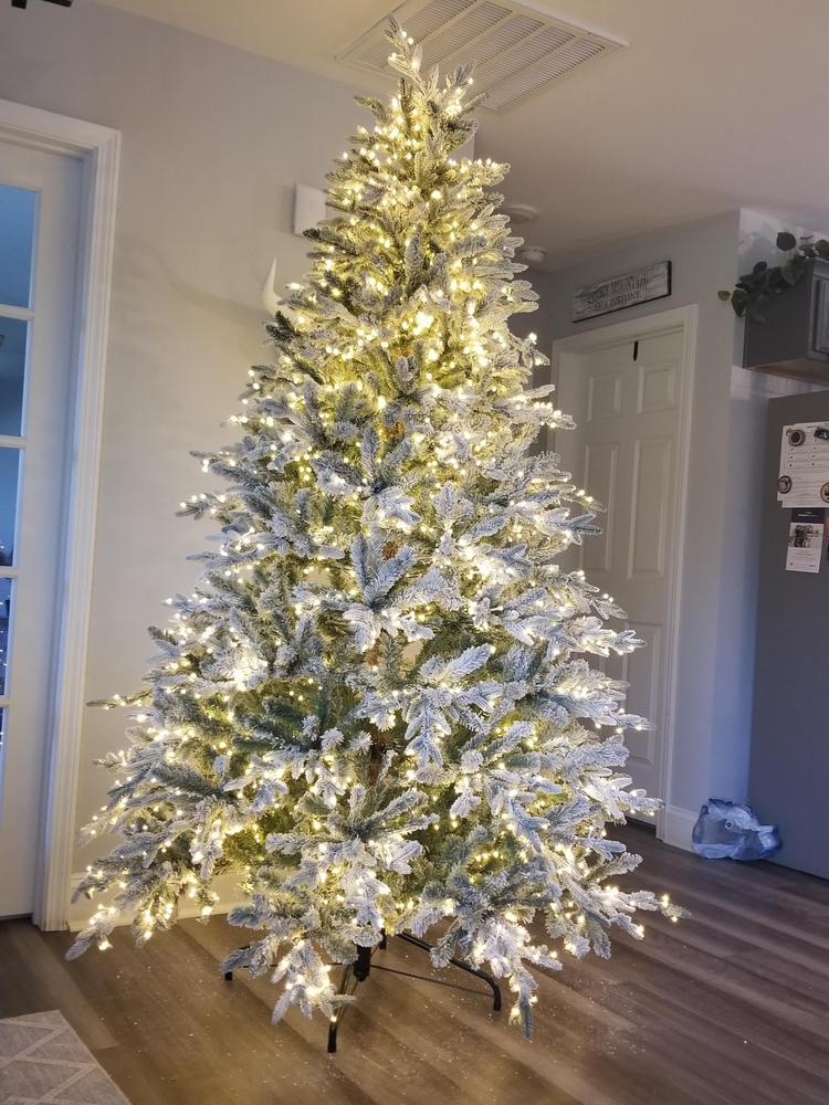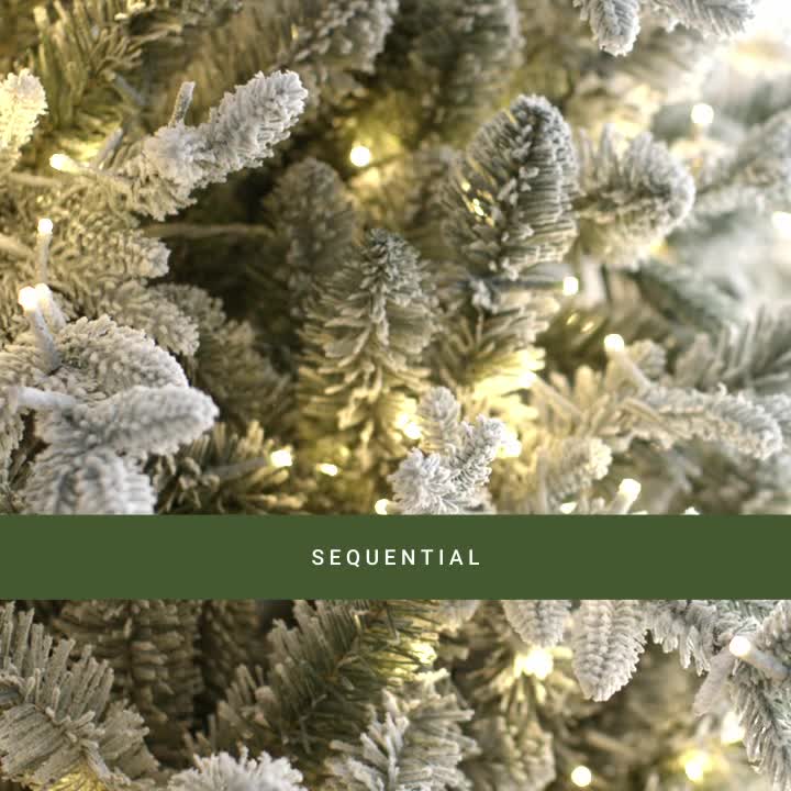 Capture Christmas magic with the lifelike spruce details in our premier Bradley Christmas Tree Collection. This 7.5ft. Pre-Lit Flocked Bradley Spruce Christmas Tree with 56in. diameter brings a full, natural silhouette with dense snow-dusted green branches and a soft, even glow. 3080 built-in warm white LED lights are neatly spaced, so setup is simple and the sparkle feels effortless. The dazzling array of twinkling lights are dimmable and transition from day to night. Featuring 3167 tip count while a classic white on green tone make a striking statement in any room the tree is placed. Remote control and metal stand included.