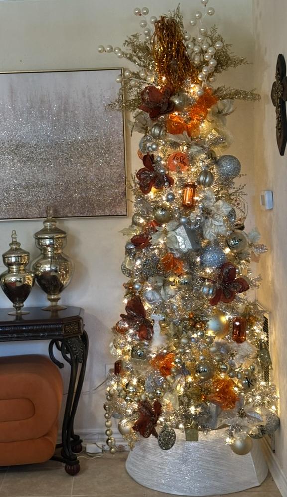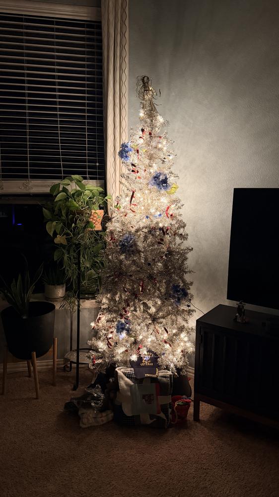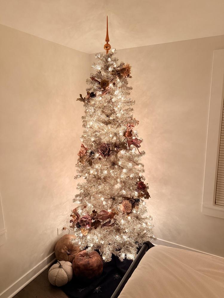 Skip the trip to a tree lot this year and anchor your holiday decorations with this 7ft. Pre-Lit Champagne Tinsel Christmas Tree with 36in. diameter. Just as festive as a live tree, this artificial tree features 766 champagne hued tips to recreate the look of a natural tree-all without the upkeep. This tree is pre-lit with 350 clear white incandescent lights woven throughout the branches. This Christmas tree features a slender shape that makes storage easy. It also arrives with a metal stand, so all you need to do is add a tree skirt, your favorite ornaments then sit back and enjoy the season.
