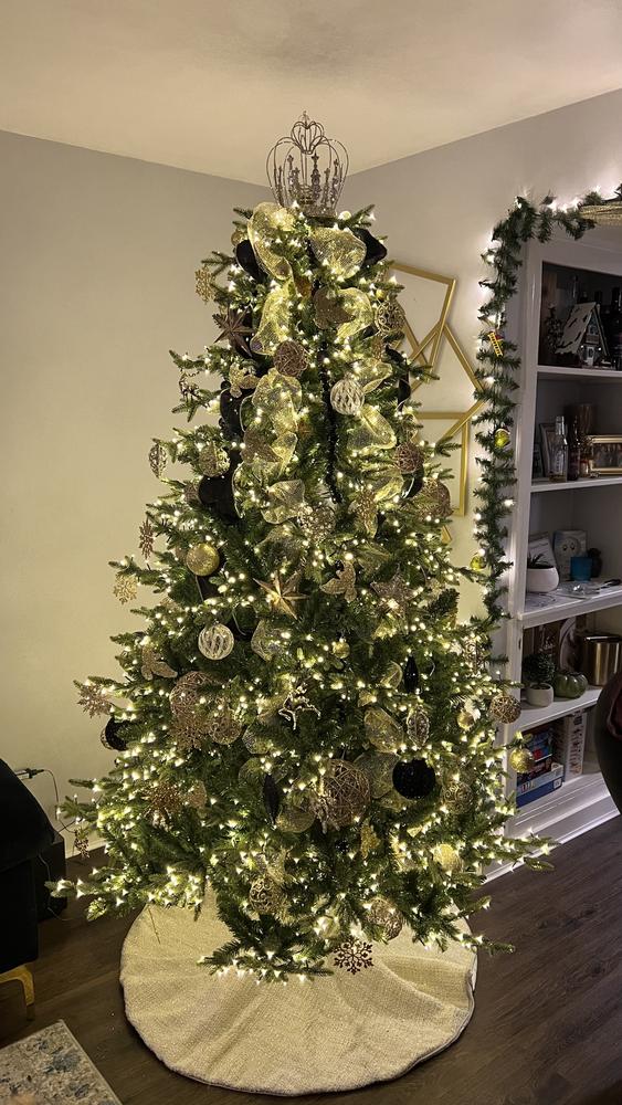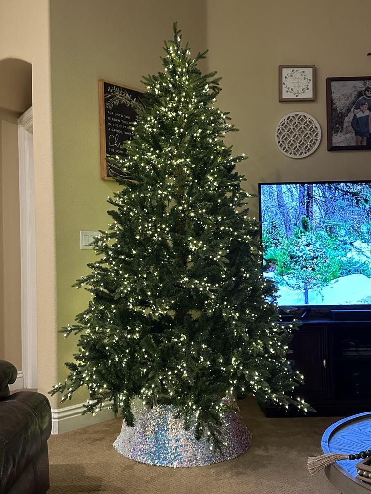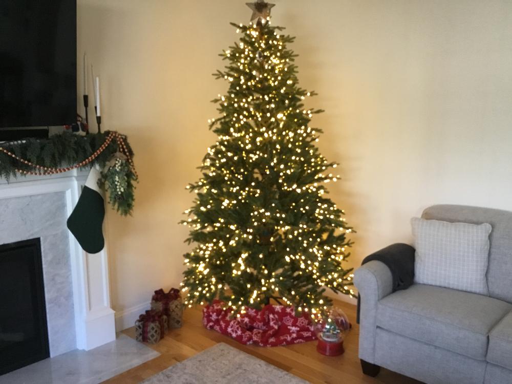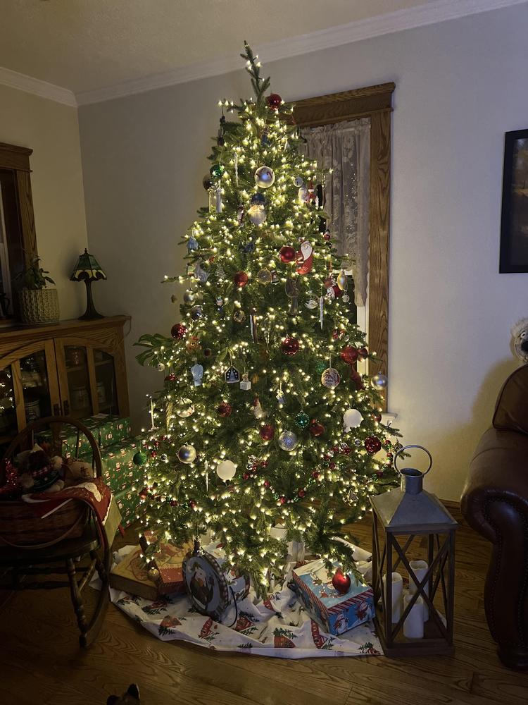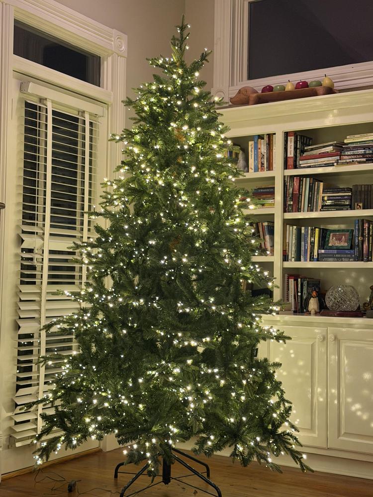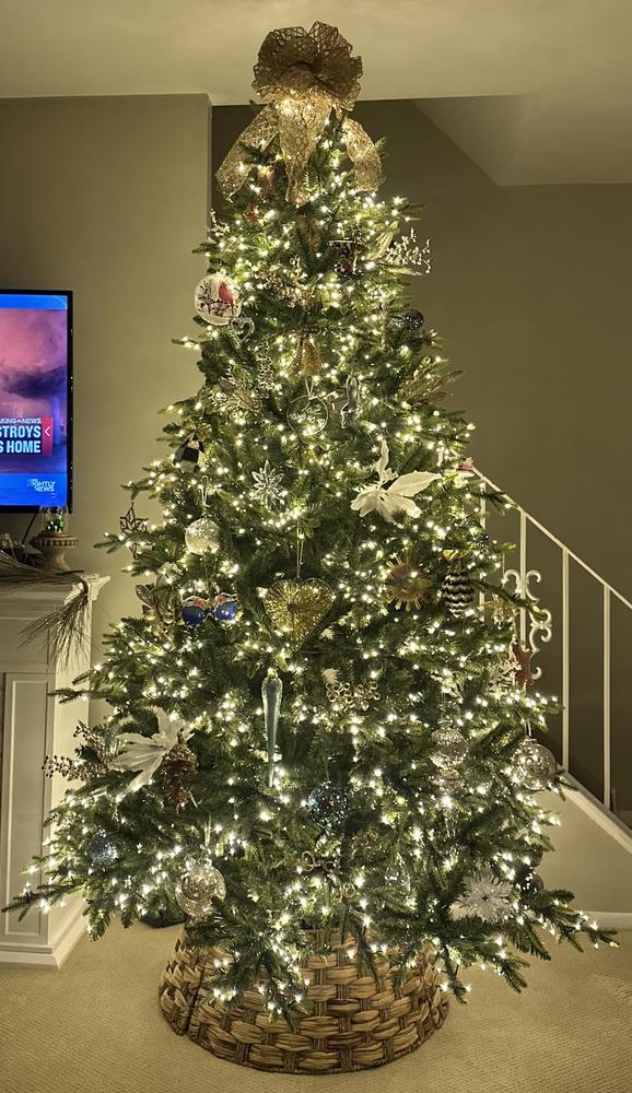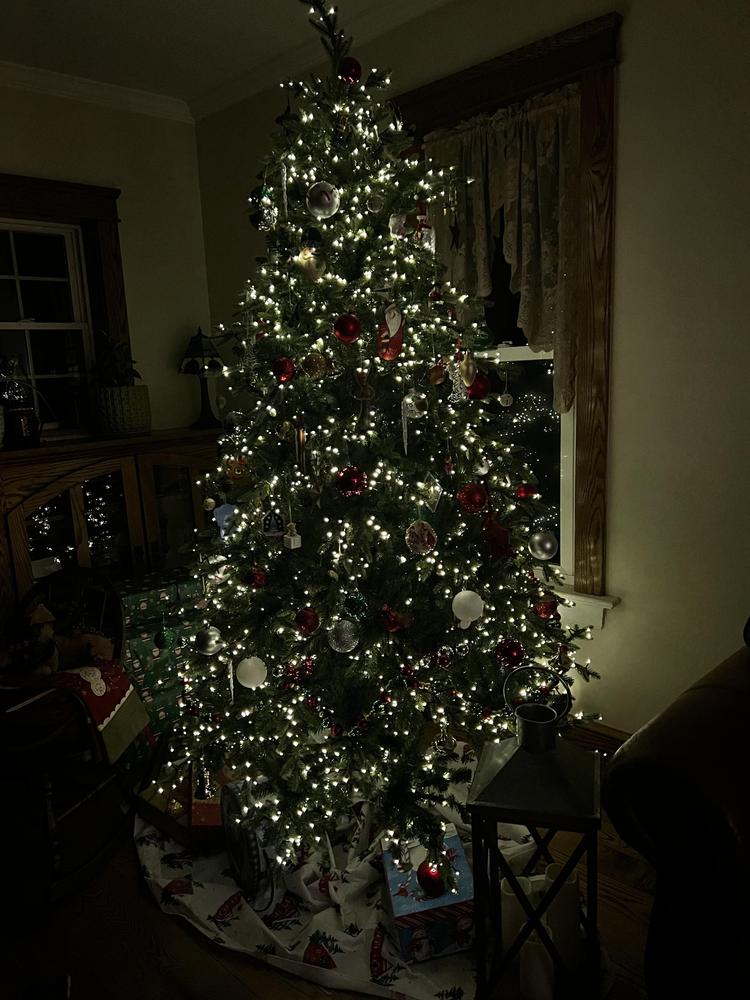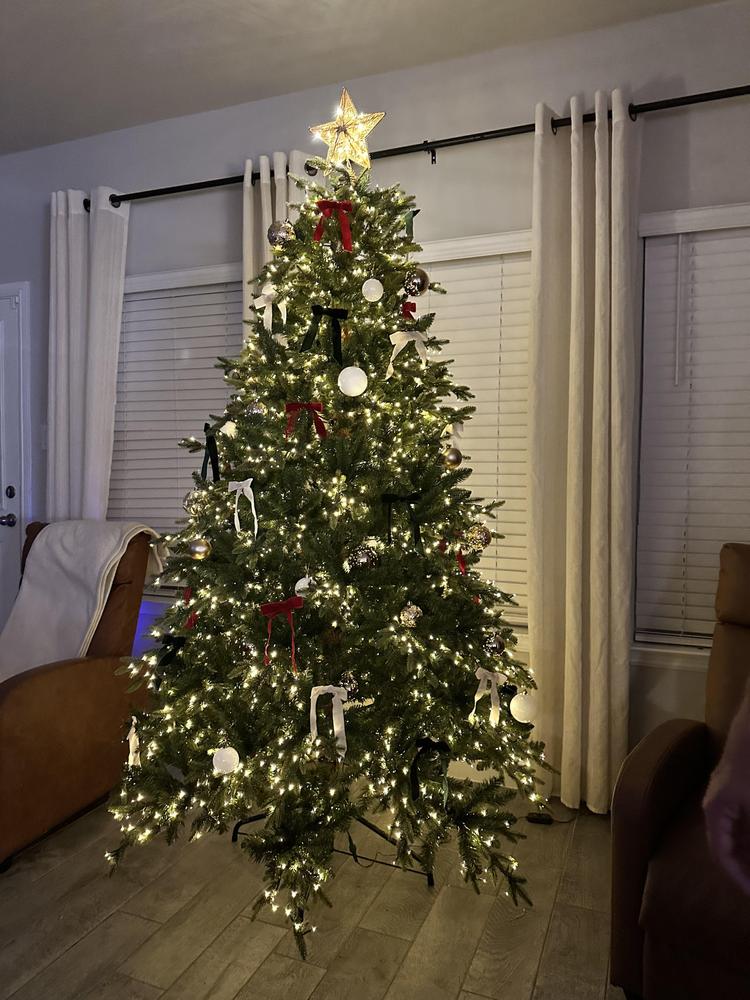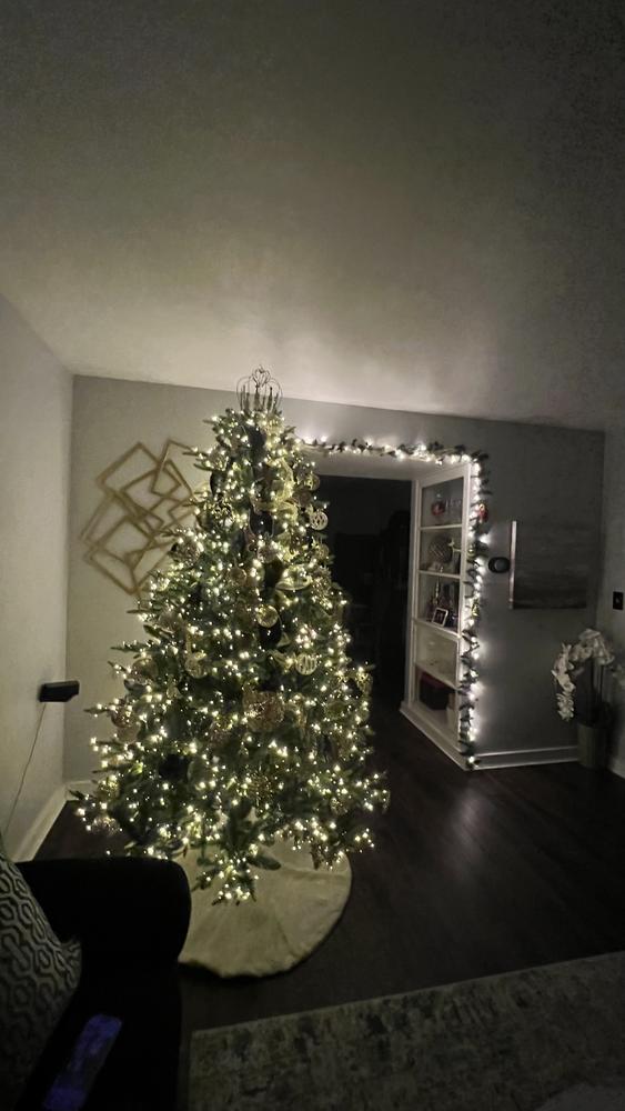 Capture Christmas magic with the lifelike spruce details in our premier Bradley Christmas Tree Collection. This 7.5ft. Pre-Lit Bradley Spruce Christmas Tree with 56in. diameter brings a full, natural silhouette with dense green branches and a soft, even glow. 3080 built-in warm white LED lights with 6 different functions are neatly spaced, so setup is simple, and the sparkle feels effortless. The dazzling array of twinkling lights are dimmable and transition from day to night. Featuring 3167 tip count and a classic green tone it makes a striking statement in any room the tree is placed. Remote control and metal stand included.