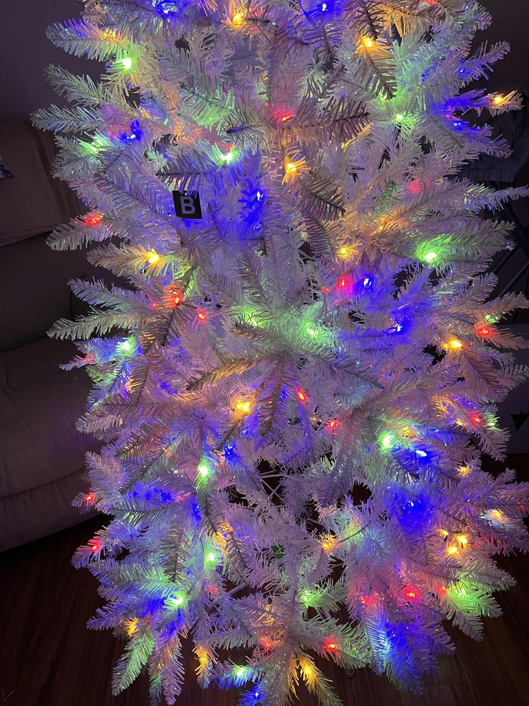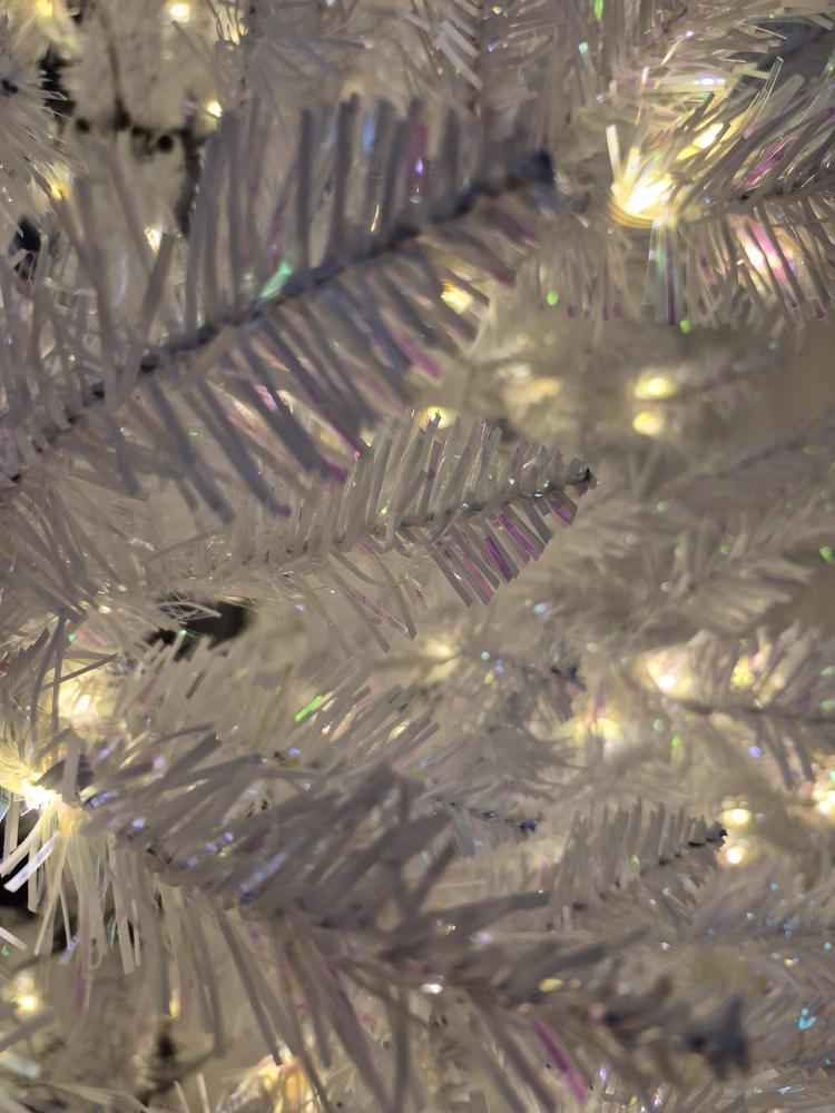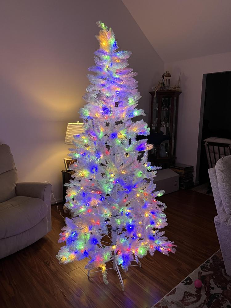 Make the season bright with this Pre-Lit LED White Iridescent Fir Christmas Tree. Standing 7ft. tall with a 42in. diameter, this wonderful white tree offers a slim silhouette that feels lush. 1000 tip count and a metallic finish add depth and a soft shimmer from every angle. Plug-in LEDs are already in place for quick setup and an even, inviting glow. Featuring 400 color-changing LED micro dot lights with 9 different functions. The sturdy branches hold their shape and showcase your ornaments with clean, modern style.