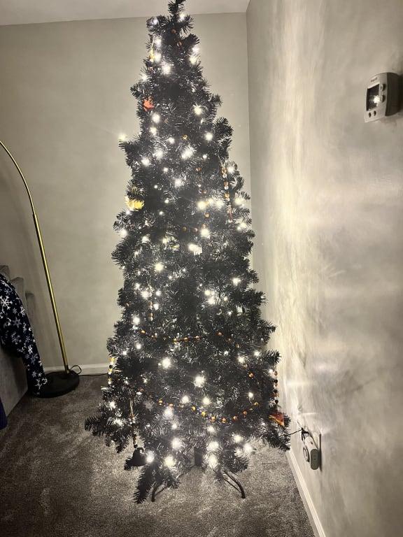 Start early, set up in October and go all out for Halloween, transition to fall and then Christmas anchoring your holiday decorations with this 7ft. Pre-Lit LED Artificial Black Fir Tree with 38in. diameter. Just as festive as a live tree, this piece is made with metal-hinged branches that are covered with 780 black tips to recreate the look of a natural tree. Lit with 350 warm white LED lights are pre-strung, so you can brighten up your space as soon as you plug this holiday tree in. This tree comes apart into several tiers for easy storage. Includes metal tree stand for quick and easy setup.