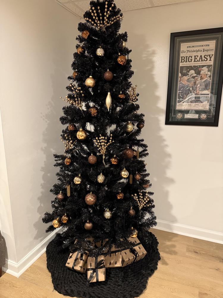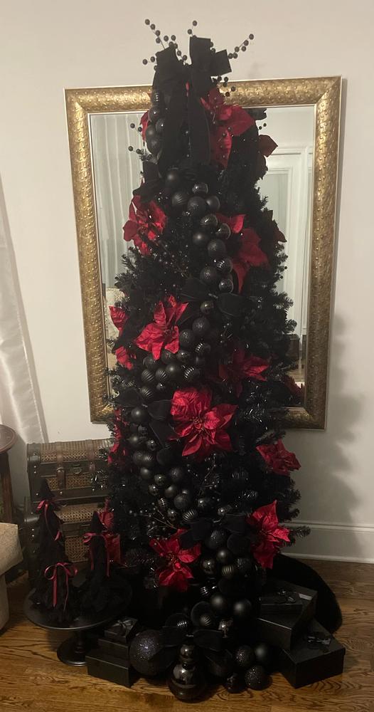 Start early, set up in October and go all out for Halloween, transition to fall and then Christmas anchoring your holiday decorations with this 7ft. Pre-Lit LED Artificial Black Fir Tree with 38in. diameter. Just as festive as a live tree, this piece is made with metal-hinged branches that are covered with 780 black tips to recreate the look of a natural tree. Lit with 350 warm white LED lights are pre-strung, so you can brighten up your space as soon as you plug this holiday tree in. This tree comes apart into several tiers for easy storage. Includes metal tree stand for quick and easy setup.