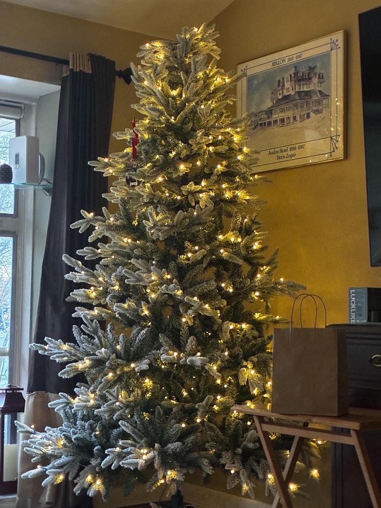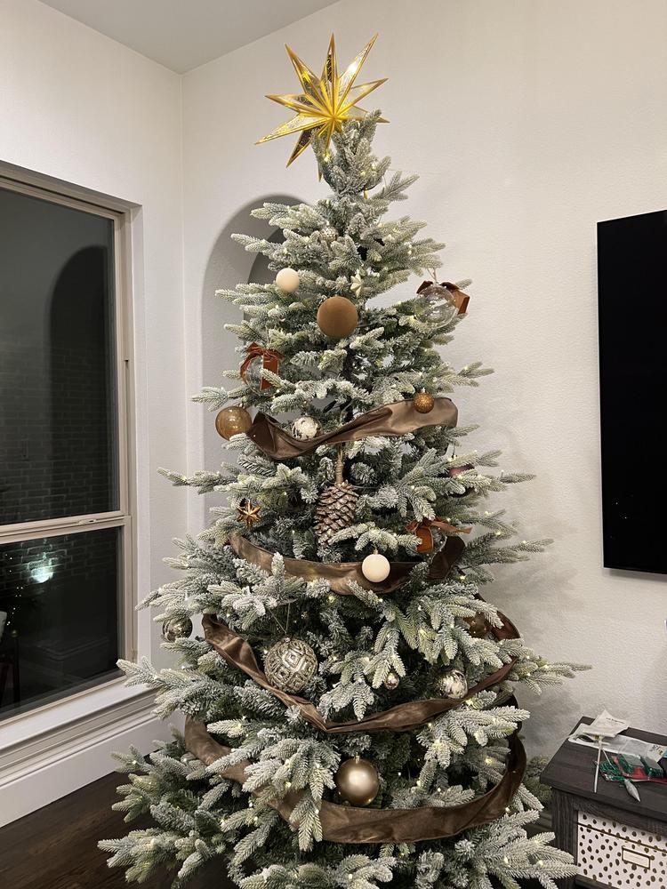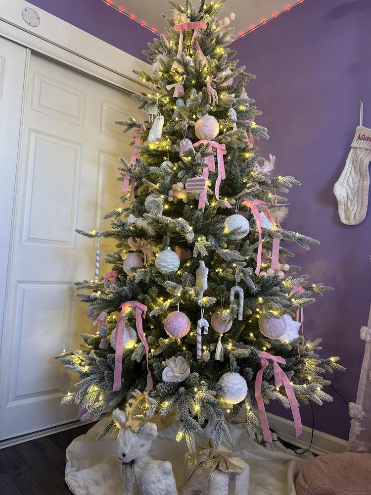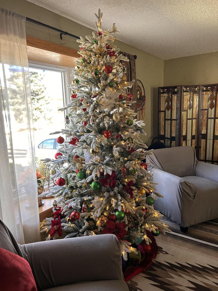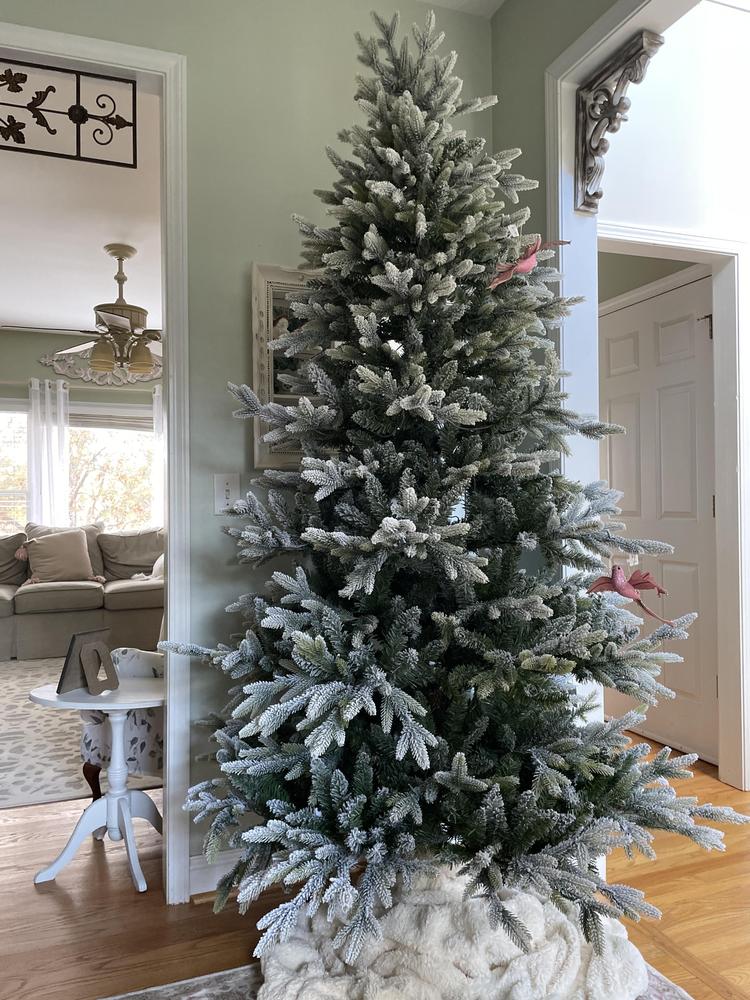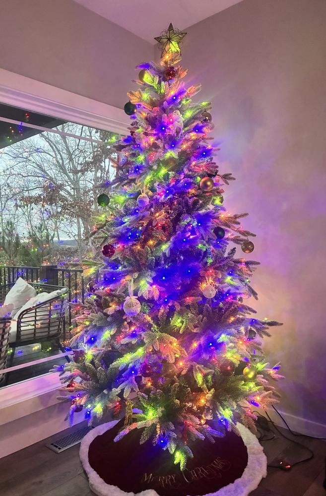 Skip the trip to a tree lot this year and anchor your holiday decorations with this 7.5ft. Pre-Lit Flocked Glenco Spruce Artificial Christmas Tree with 53in. diameter. Just as festive as a live tree, this piece is made with metal-hinged branches that are covered with 2340 tips and comes pre-lit with 500 color-changing LED lights with 8 functions like clear and color fading, alternating and steady settings. This Christmas tree features a full shape broken up into assembly sections to make storage easy. It also arrives with an included metal stand, so all you need to do is add a tree skirt, your favorite ornaments then sit back and enjoy the season.