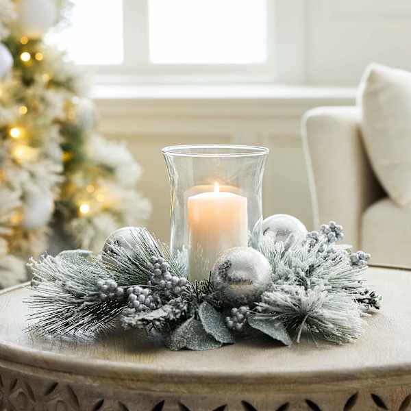 Bring winter charm to your home with the 8in. Ball, Berry and Snow Pine Glass Holder. Snowy faux pine, bright red berries, and frosted ornaments surround a clear glass holder for a warm candle glow. This timeless Christmas candleholder is an easy holiday centerpiece for a mantel, dining table, or entryway. Crafted from lifelike plastic greenery in a crisp white finish that complements classic and modern decor.
