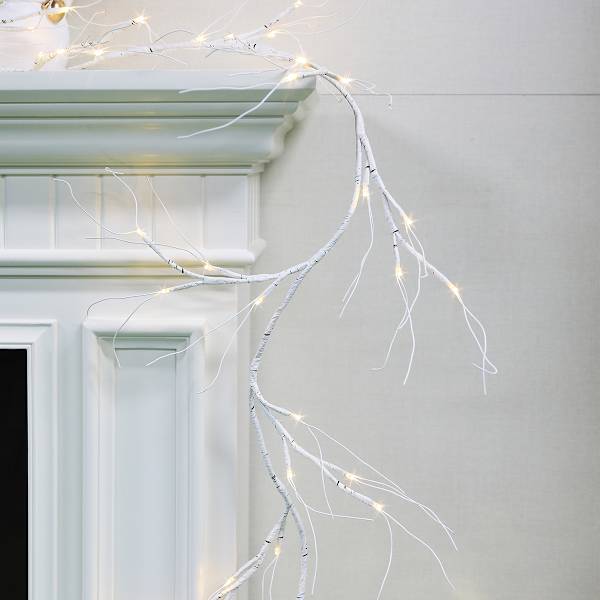Bring a soft glow to your space with this 6ft. birch garland, dotted with warm white LEDs along slender, twiggy branches. The white finish adds clean, modern texture that pairs easily with greenery, vases, or seasonal decor. Battery power lets you skip outlets and hide cords for a neat look on mantels, shelves, or stair rails. Light, flexible plastic construction makes shaping simple, whether you drape, wrap, or weave it into a centerpiece.