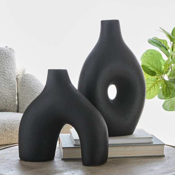 Streamlined and striking, this 16in. black ceramic vase pairs a matte body with a glossy rim for subtle contrast. Standing tall, it brings height without taking over your surface. The clean, modern silhouette looks sculptural on its own or styled with dried stems and greenery. Set it on a console, mantel, or shelf to anchor your decor with bold, understated style. The glossy rim catches the light while the smooth ceramic finish keeps the look crisp. A go-to modern vase for living rooms, entryways, and offices, perfect for a seasonal refresh or year-round display.