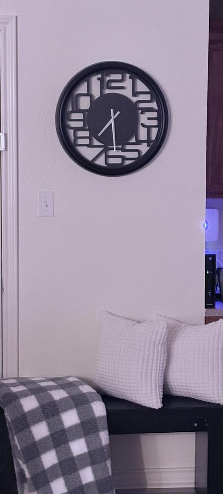 Add a hint of modernity to your home decor with this sleek black wall clock. Featuring an interesting cutout design, this clock effortlessly combines functionality and style, making it a standout piece in any space.