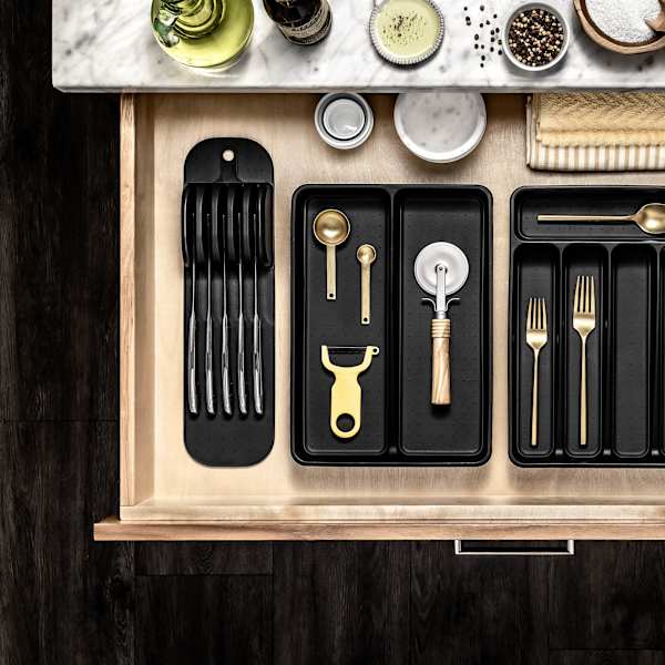 Black Mini Utensil Tray keeps your drawer streamlined and clutter-free with a clean, modern look. The compact 13x9x2in. size fits smaller spaces while making the most of every inch. Made from polypropylene, it features multiple compartments to sort flatware, gadgets, and everyday tools. The black finish adds a sleek touch that blends with any drawer setup. Easy to wipe clean, this utensil organizer is a simple upgrade for smart kitchen drawer storage.