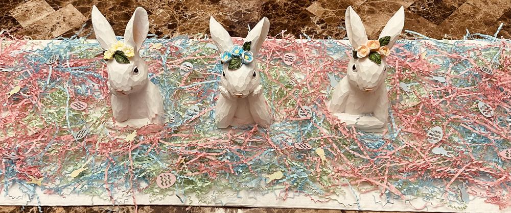 Add a touch of whimsy and charm to gift bags and Easter baskets. blue crinkle paper shreds and cutout Easter bunnies lend texture, volume, and visual interest to your display. This colorful Easter Grass is great for holiday celebrations, hunts, gifts and more. Sold in a convenient plastic bag and it's made of 100% recycled papers.