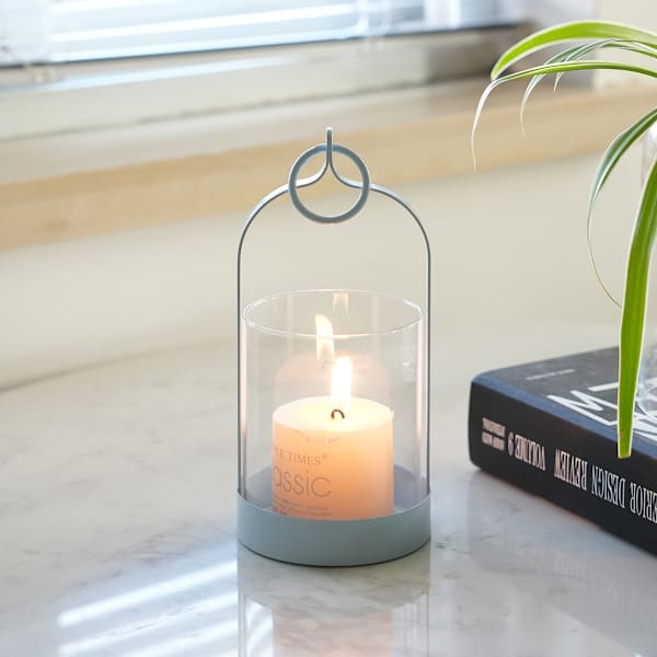 Round out your indoor or outdoor decor's visual appeal with our 8in. Blue Metal and Glass Lantern with Ring Handle that showcases a wonderfully simple open design. This candle holder's architectural details add a pop to your look, while the design's pale blue finish blends effortlessly into any color palette. Set this piece inside with your favorite pillar candle and it'll round out your space with wonderful coordinating decor.