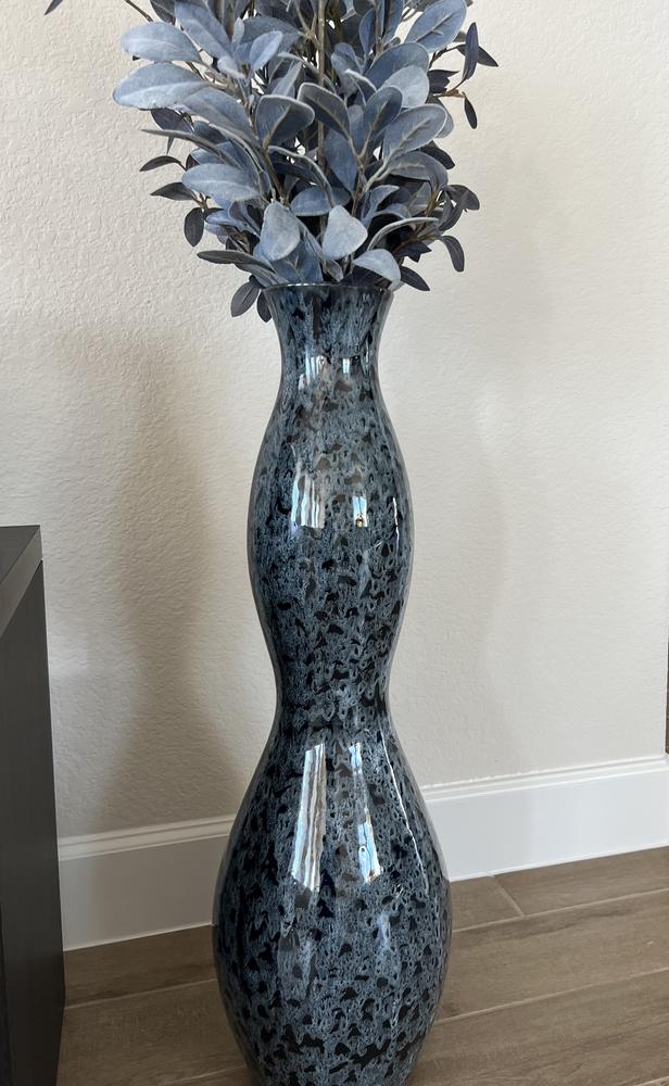 If your decor aesthetic is wonderfully eclectic, our 10x31in. Blue Variable Glaze Ceramic Floor Vase may be the element your home's been missing. This deep hued ceramic floor vase is absolutely superb with its tall, curvy silhouette and slightly mottled surface. Place it in your entryway, on the hearth or on a counter to add an amazing twist to your decor.