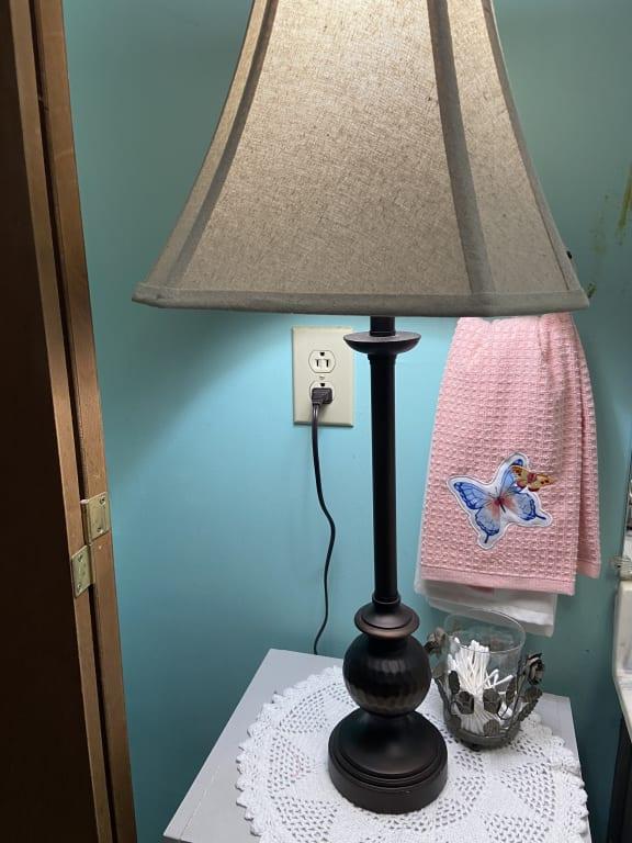 Illuminate your space with the Bronze and Wood Table Lamp.