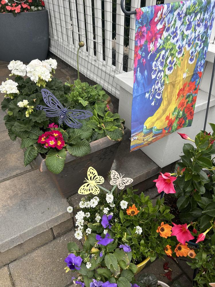 CheckoutInstantly create a spectacular display in your yard with this 14in. Butterflies Metal Yard Stake. It features a wonderful yellow and pink cutout butterfly design and stands tall above your plants and flowers. This garden stake is the perfect decoration for outdoor whimsy lovers. This clever stake will add the perfect touch of personality to any garden space. With the lively spring butterfly details, this stake makes a great gift for garden and outdoor enthusiasts.