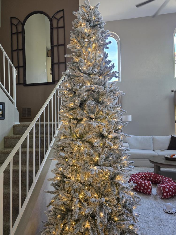 Skip the trip to a tree lot this year and anchor your holiday decorations with this 9ft. Pre-Lit Flocked Seattle Spruce Artificial Christmas Tree with 40in. diameter. Just as festive as a live tree, this piece is made with metal-hinged branches that are covered with 2296 tips and comes pre-lit with 650 warm white LED lights. This Christmas tree is broken up into assembly sections to make storage easy. It also arrives with an included metal stand, so all you need to do is add a tree skirt, your favorite ornaments then sit back and enjoy the season.