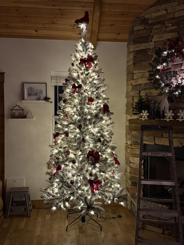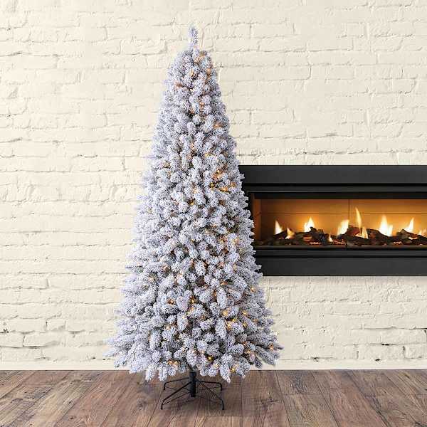 Deck the halls in style with our 9ft. Pre-Lit Flocked Wilson Pine Christmas Tree with 50in. diameter. This magnificent tree brings the beauty of a freshly fallen winter wonderland right to your living room with 1175 tips. Imagine curling up by the fireplace, sipping hot cocoa, and admiring the gentle snowfall effect of this stunning pre-lit tree. The energy-efficient 650 warm white LED lights will keep your home aglow all season, while the flocked design adds an elegant, festive touch. Perfect for making magical holiday memories with family and friends. Metal stand included.
