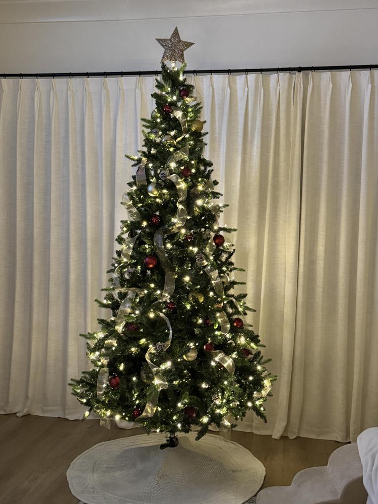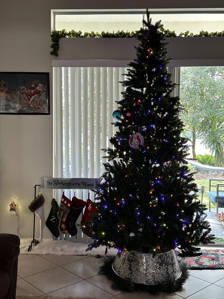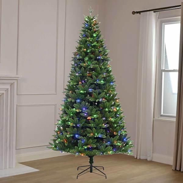 Say hello to our 9ft. Pre-Lit Hartford Spruce Christmas Tree, a tall, full silhouette with a classic spruce profile and lights already in place. At 9ft. tall and 58in. in diameter, it makes a striking centerpiece without overwhelming your space. Pre-lit with 9 different functions, the 450 color-changing LED lights are evenly spaced giving a balanced glow from every angle. Features 2026 green tips that offer a fresh, natural look that's ready for your favorite decorations. Set it up in minutes and let the holiday season shine. Metal stand included.