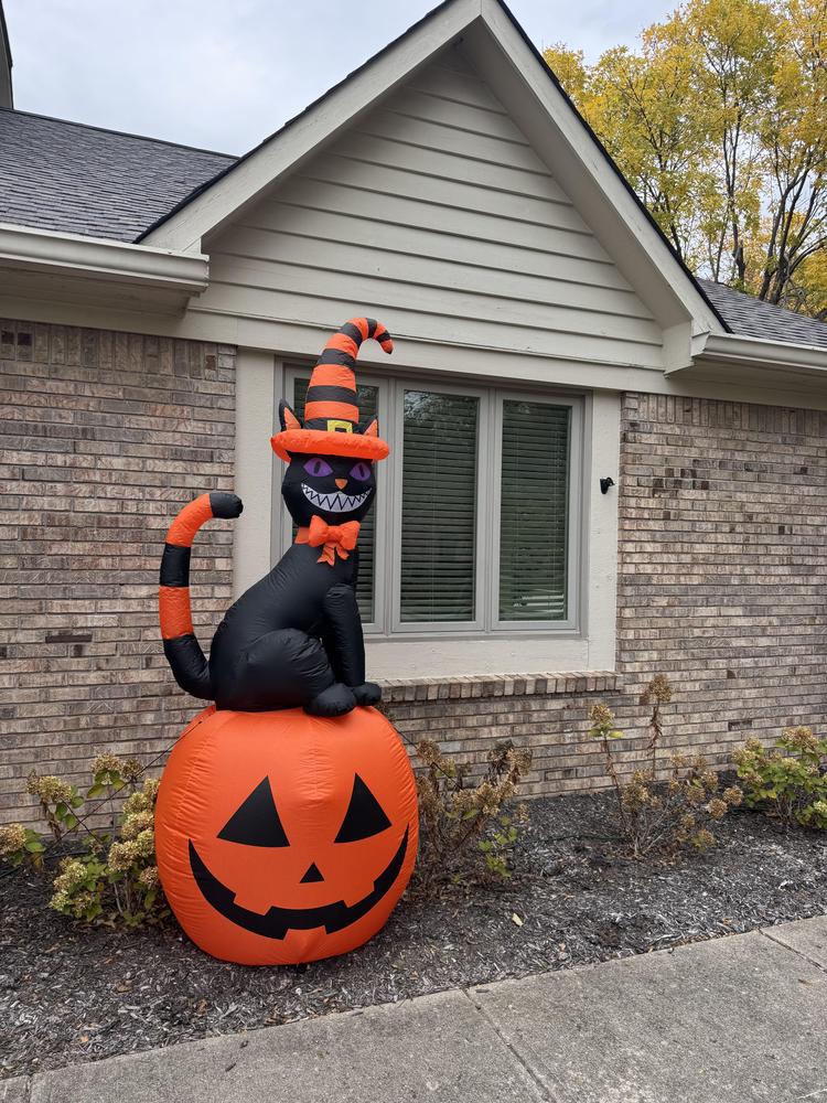Blow up your holiday curb appeal with this 8ft. Cat on Jack-O'-Lantern Halloween Inflatable Decoration. This mischievous duo is sure to draw attention. Whether you place this Halloween inflatable in the front yard or backyard, it serves as a bold and eye-catching seasonal centerpiece. Passers-by will be drawn to its unique and colorful presence, making your home stand out in the neighborhood during the festive season. The polyester black cat and pumpkin comes with a blower to quickly inflate this amazing decoration. When the festivities are over, deflating and storing this blow up is equally simple. You can fold it up and tuck it away for continual use for years to come. The inflatable cat wearing striped witches hat and jack-o'-lantern lighted display is full of character and provides an interactive element for trick-or-treaters and party goers all season long.
