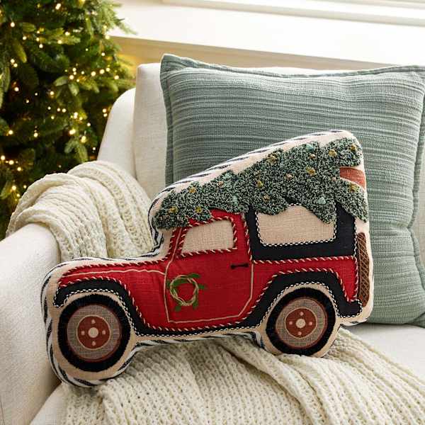 Drive home the holiday spirit with the 18x12in. Christmas Truck Shaped Throw Pillow. Featuring a cheerful red pickup and evergreen tree, this playful accent brings vintage charm to sofas, armchairs, and entry benches. Made from soft cotton with a comfortably plush feel, it adds cozy support and seasonal style. The shaped silhouette gives your space dimension and a fun focal point. It layers easily without crowding your seating. The multi color design pairs effortlessly with classic plaids, knits, and neutrals, making it a standout in any holiday decor.