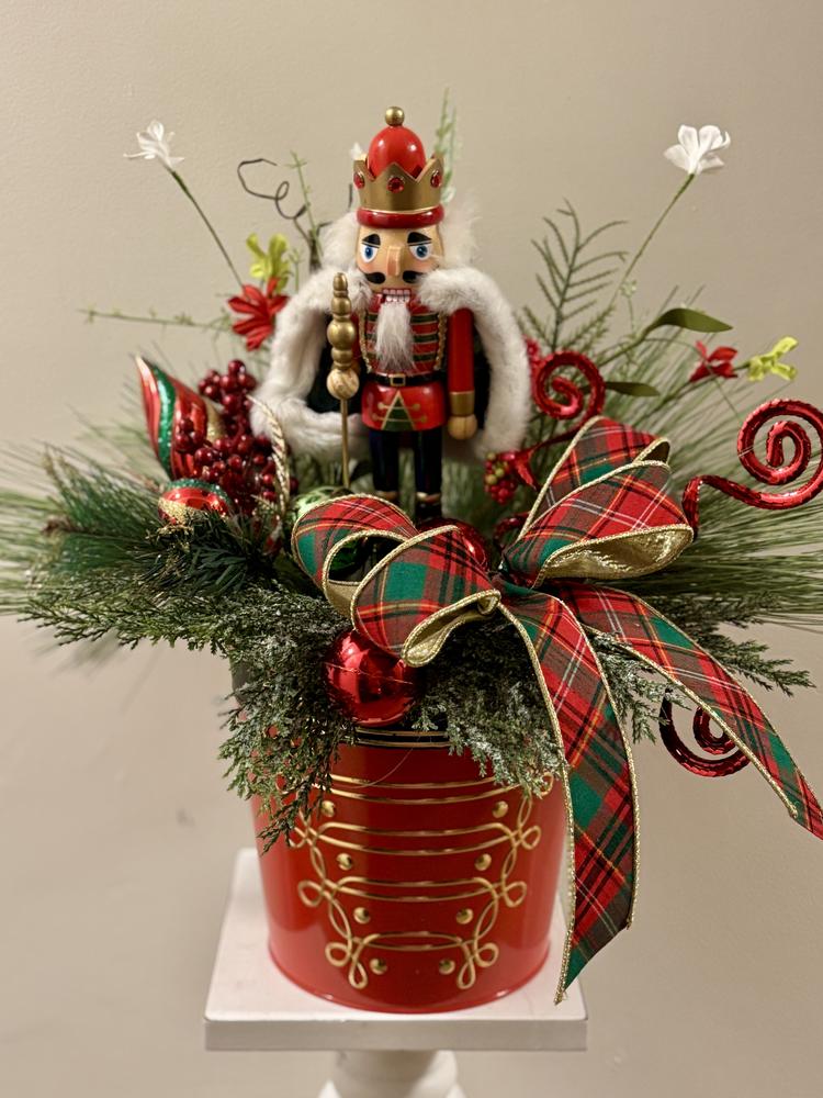 Enjoy all the traditions of Christmas with pops of velvet poinsettias and bold patterns make it oh-so-merry, with a touch of black and white graphics with items from our Classic Christmas Collection.Say hello to our 8in. Metal Nutcracker Container. The red, black and gold metallic finish and timeless artwork bring festive charm to mantels, shelves, and entryways. This festive container is ideal for organizing ornaments, greenery, cards, and small gifts. The interesting silhouette blends with traditional and modern holiday decor. Style one on its own or pair multiples for a coordinated Christmas display.