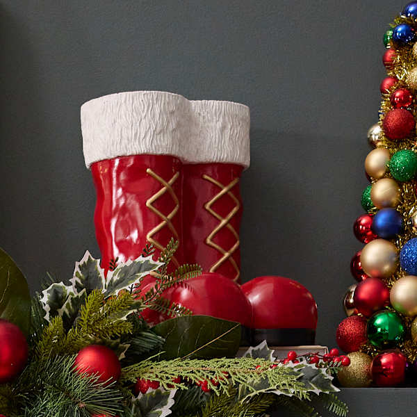Enjoy all the traditions of Christmas with pops of velvet poinsettias and bold patterns make it oh-so-merry, with a touch of black and white graphics with items from our Classic Christmas Collection. Make the season merry with these 12in. Red Santa Boots, sculpted in resin with a bright red finish and snowy white cuffs. The double-boot silhouette brings timeless holiday charm to mantels, console tables, and shelves. This tabletop decor adds a bold pop of color and a playful nod to Santa in any room. Style them with garlands, ornaments, and twinkle lights for a standout Christmas display.