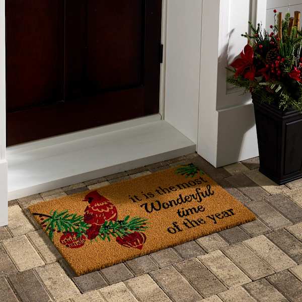 Welcome the season with the 18x30in. "it is the most Wonderful time of the year" Cardinal Coir Doormat. A bright red cardinal and evergreen accents pop against the natural coir background, with classic script for a timeless holiday look. The rectangular size fits most doorways while thick coir bristles help brush off shoes before guests step inside.