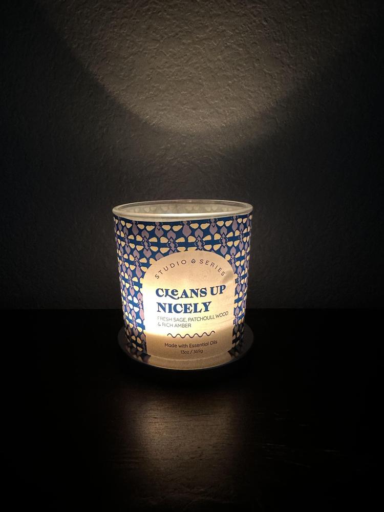 Our 13oz. lidded Cleans Up Nicely Scented Jar Candle is a perfect addition to your seasonal ambiance. With a refreshing fresh sage, patchouli wood and rich amber fragrance, this candle will add a boost to the setting you've created. Comes with a lid that can be covered when not in use-this adds to the life span of the candle.